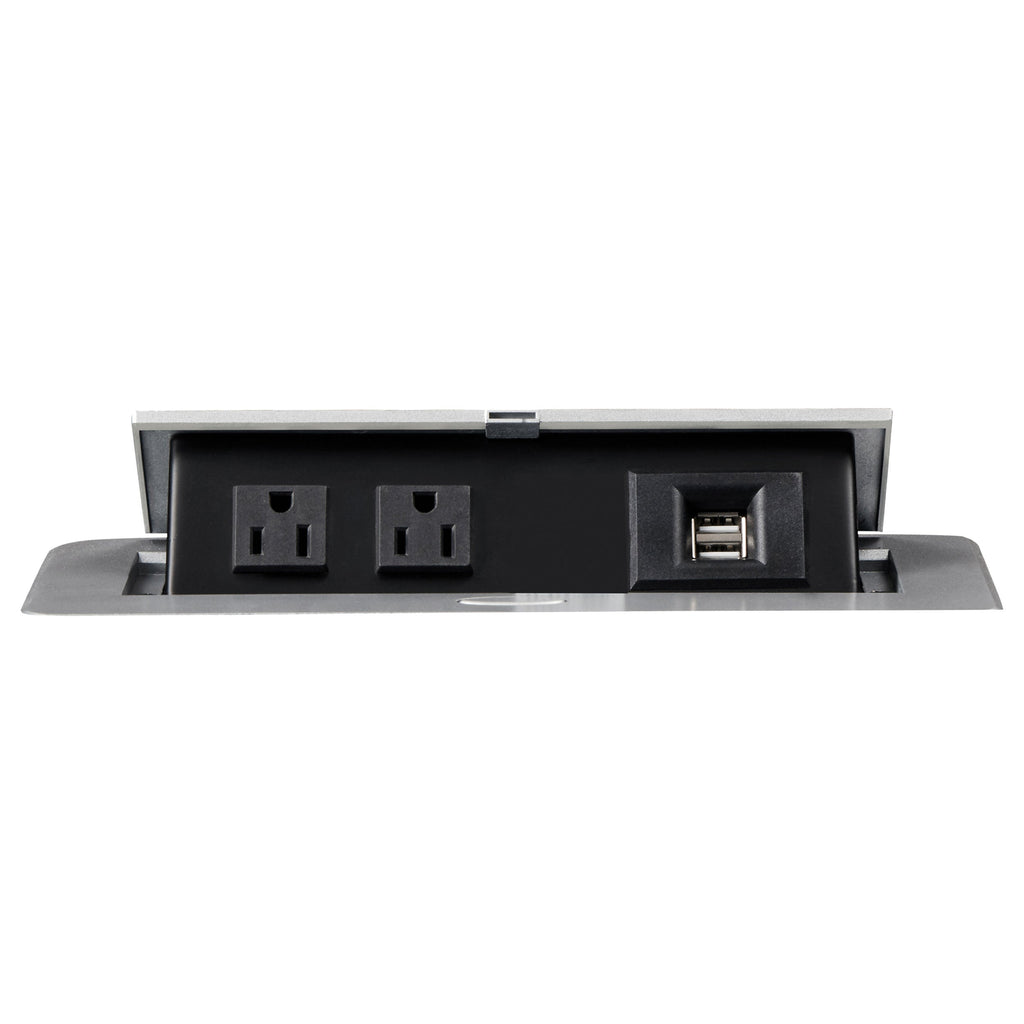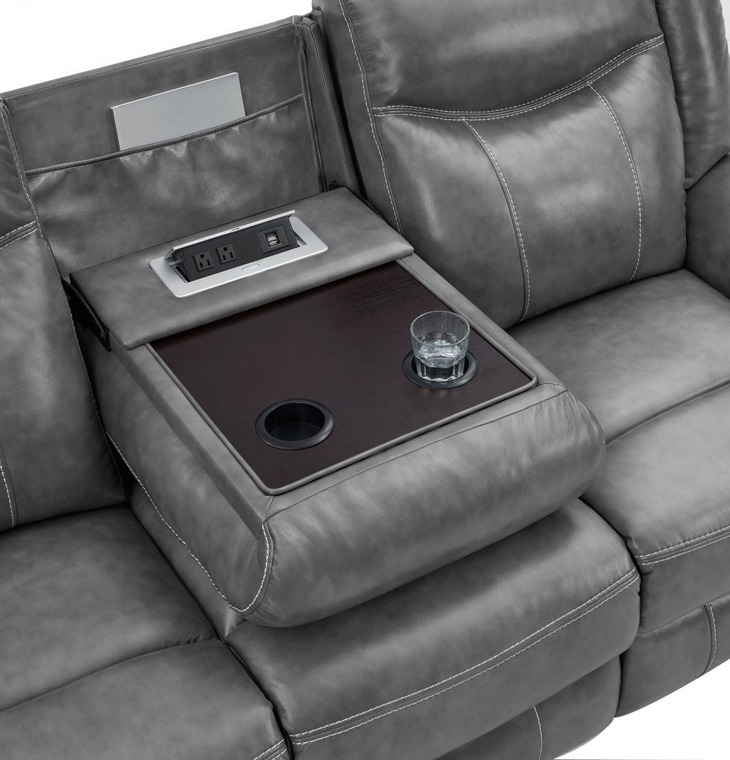 Sofa features drop-down table with pop-up power outlet (2AC/2USB), two (2) cup holders, and storage drawer
