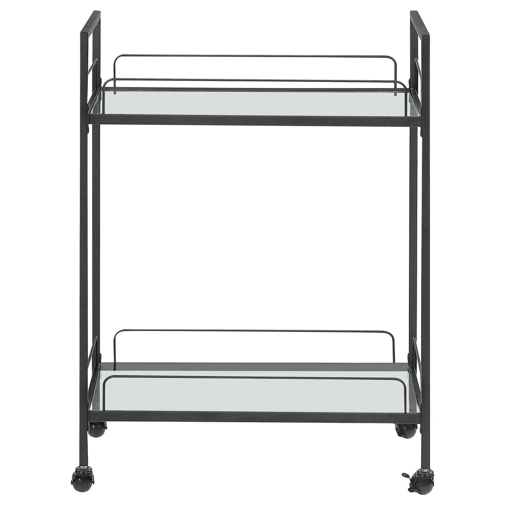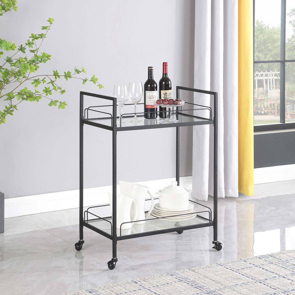 Minimal, clean lines create a versatile and sleek aesthetic to this contemporary serving cart. Built with a slim metal frame in a black hammer tone powder coated finish with caster wheels, this serving cart welcomes glassware, accessories and snacks to be smoothly transported to an entertaining area for guests and visitors. Stacked clear tempered glass shelves showcase stemware and favorite vintages to guests for their personal selection. With raised edges, you can rest easy knowing everything stays in place safely. Glide this serving cart into your living room for small get-togethers or keep it in a compact apartment as a multifunctional bar cart.