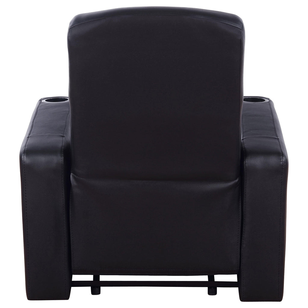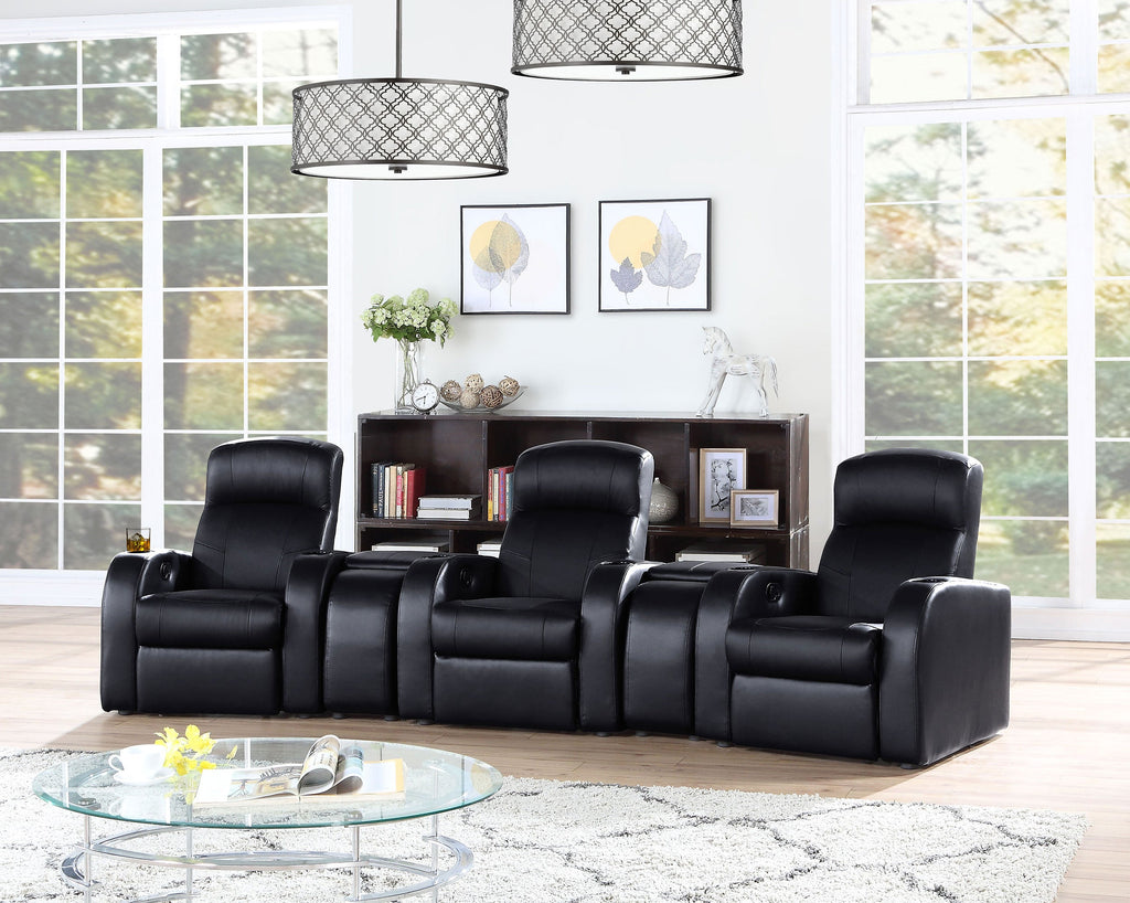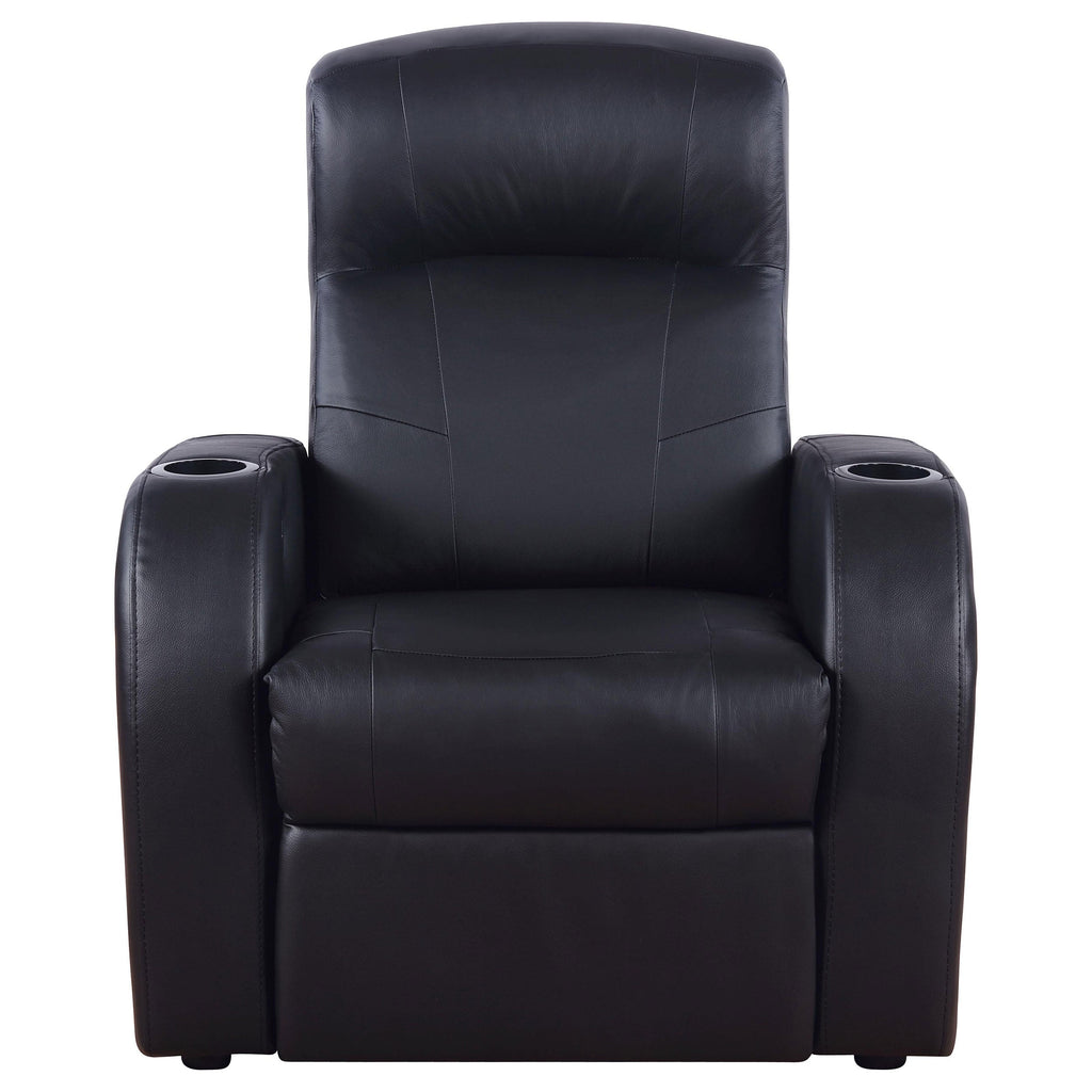 Get the movie theater experience at home with this set of recliners. Customize your home theater with your choice of seating configuration, available in numerous options. Optional center consoles offer unique storage for remotes and small items. Each top grain leather recliner is designed with its own cup holder for your favorite beverage. These black recliners are bound to improve your home theater experience and comfort levels.