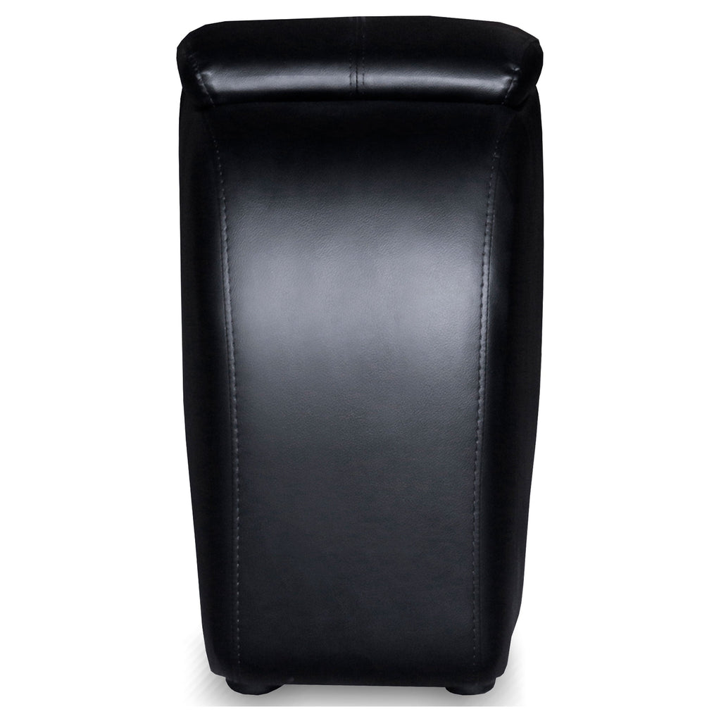 Dress up a home theater room with this sleek black console. Great for nestling between chairs, this console was designed with comfort in mind. Add extra space between recliners with the smooth front and the rounded top. Deep tones offer a clean feel to the modern silhouette. Build a set of side by side recliners for family movie night or to fill any size theater room.