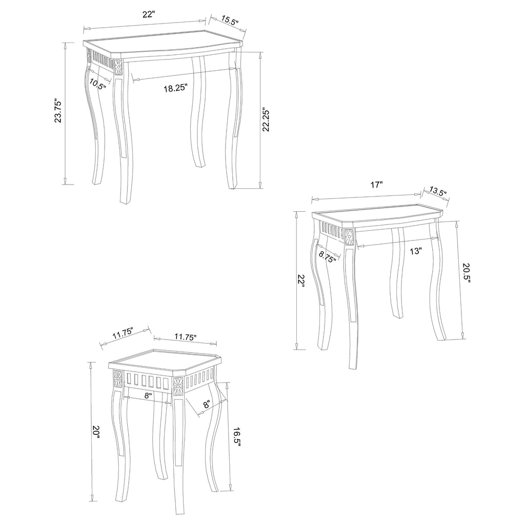 This three-piece nesting table set showcases an elegant design with beautiful detailing on the legs. The warm brown finish adds to its rich, traditional style, making it perfect for any living room space. The tables are crafted from durable engineered wood, combined with basswood veneer, and feature carved accents that bring a touch of sophistication. The compact nesting design allows for convenient storage while maintaining a classic look for your home.