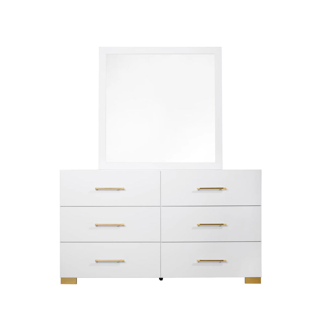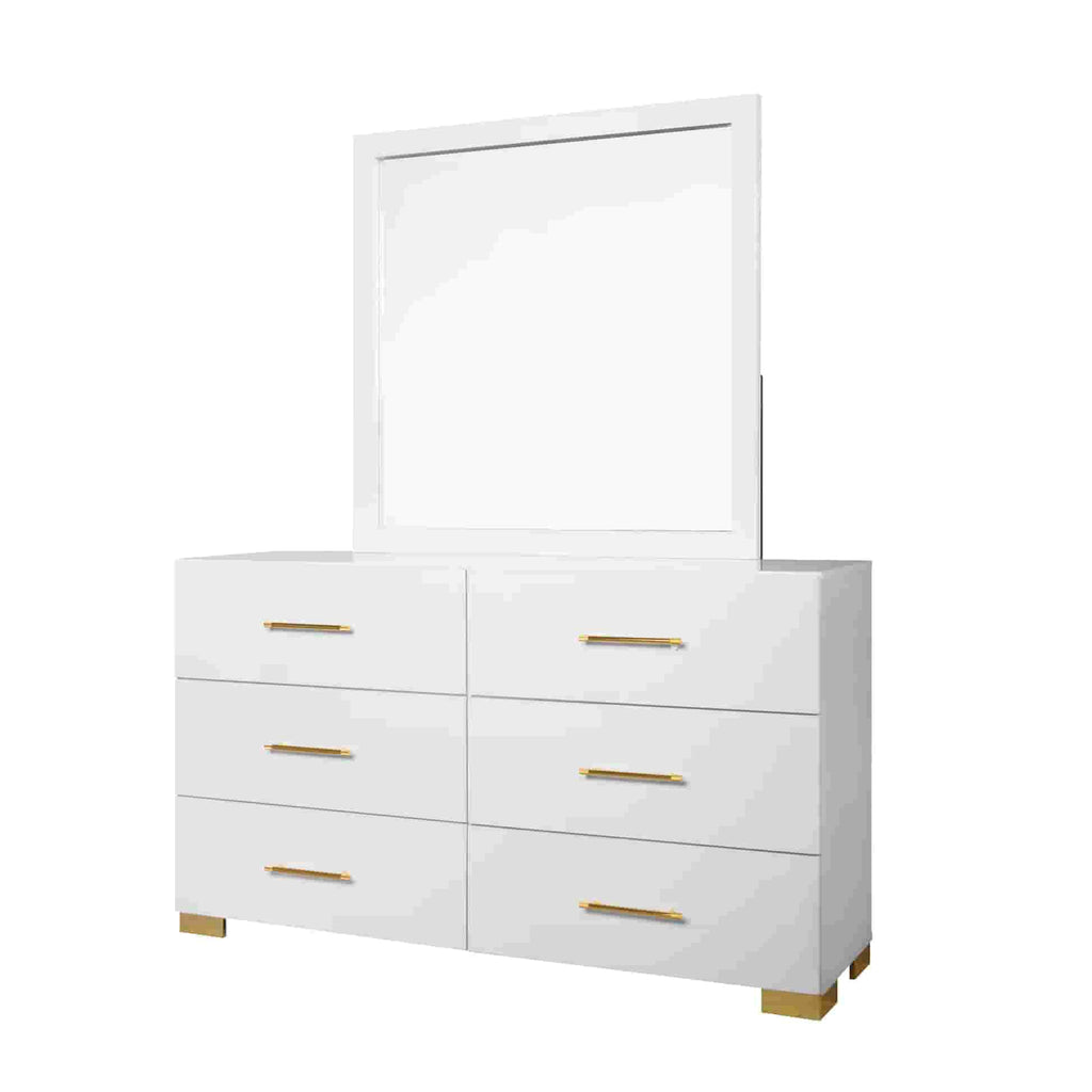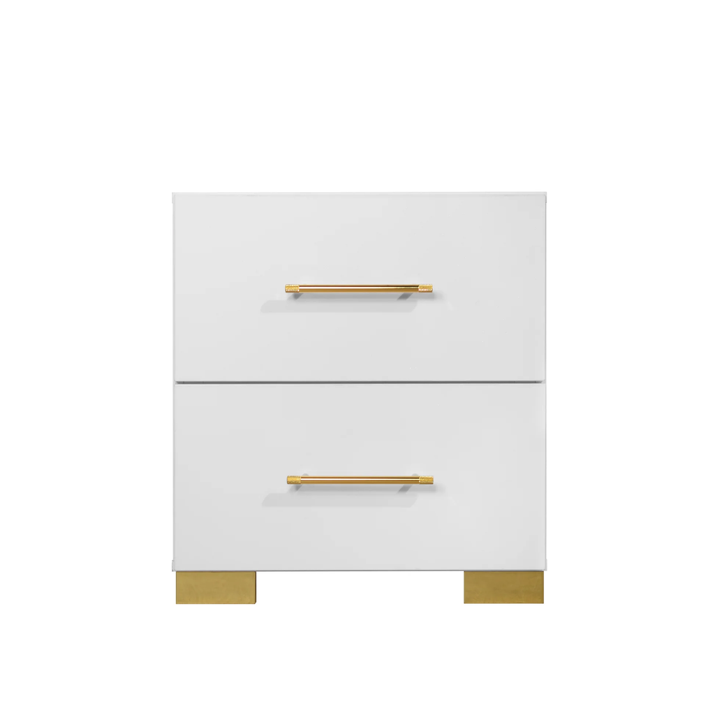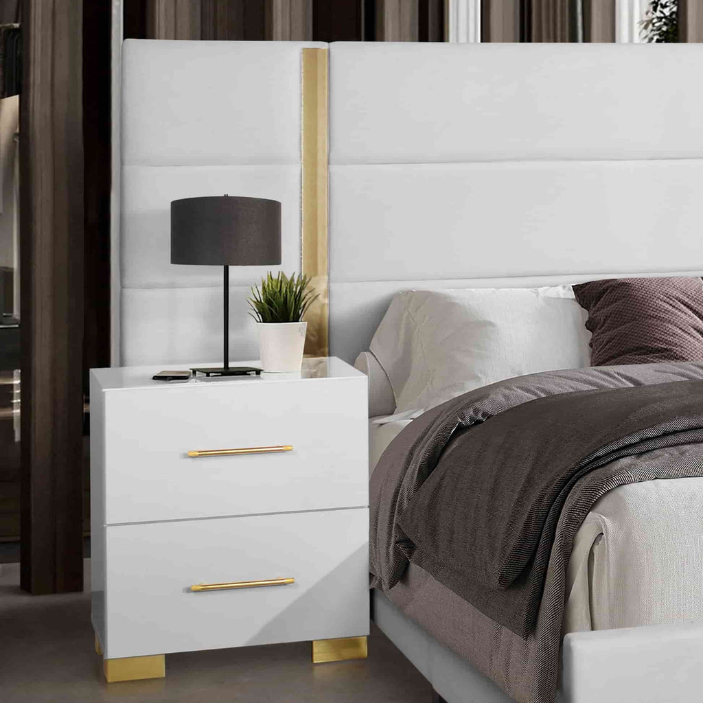 Immerse yourself in an atmosphere of pure, radiant luxury with the B3030 Darya, a collection that masters the art of expansive modern design. This set is defined by its striking High Gloss White finish, which catches and reflects light to make your master suite feel remarkably open and airy. The true showpiece is the Extended Upholstered Headboard, which stretches beyond the frame to create a dramatic, wall-to-wall architectural statement. This plush, textured backdrop is perfectly complemented by sophisticated gold accents on the precision-crafted handles and legs, offering a touch of jewelry-like refinement to the clean, minimalist silhouette of each piece.