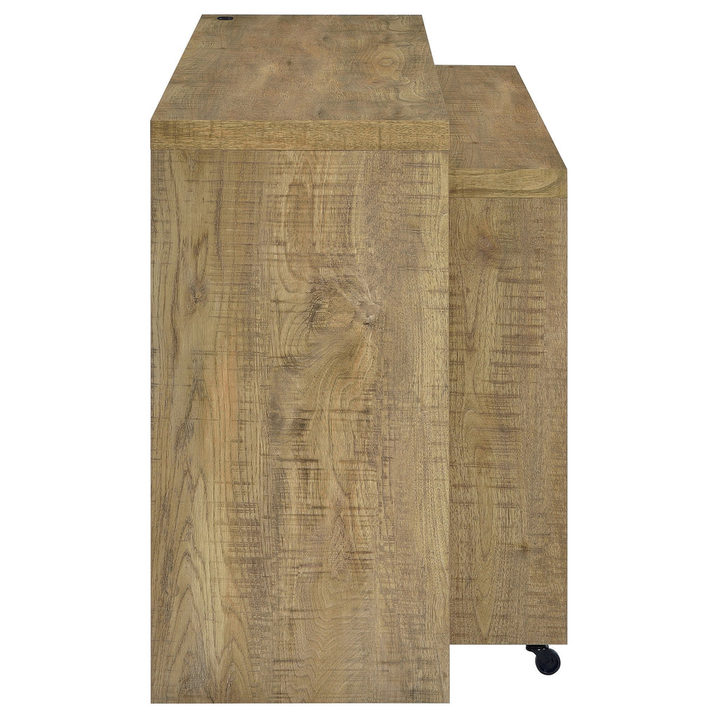 The ultimate multi-tasker, this modern four-piece counter height dining set includes two nesting tables and two backless stools. Its fresh, contemporary look features clean-lined silhouettes with a mango wood finish that's rich and natural. The larger table is stationary while the smaller table is on wheels, allowing you to create the configuration that best suits your space and activities, whether dining, working from home, or serving drinks to family and friends. Two matching barstools are backless to tuck underneath and feature a black finish with black faux leather and padded seats. The larger table is even equipped with a USB port that makes charging your phone or other small electronics smooth and seamless.