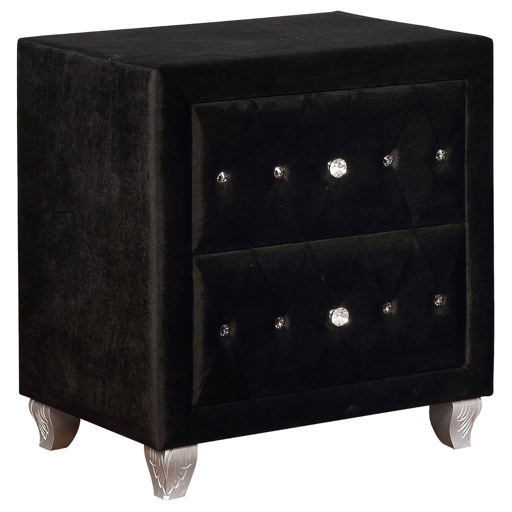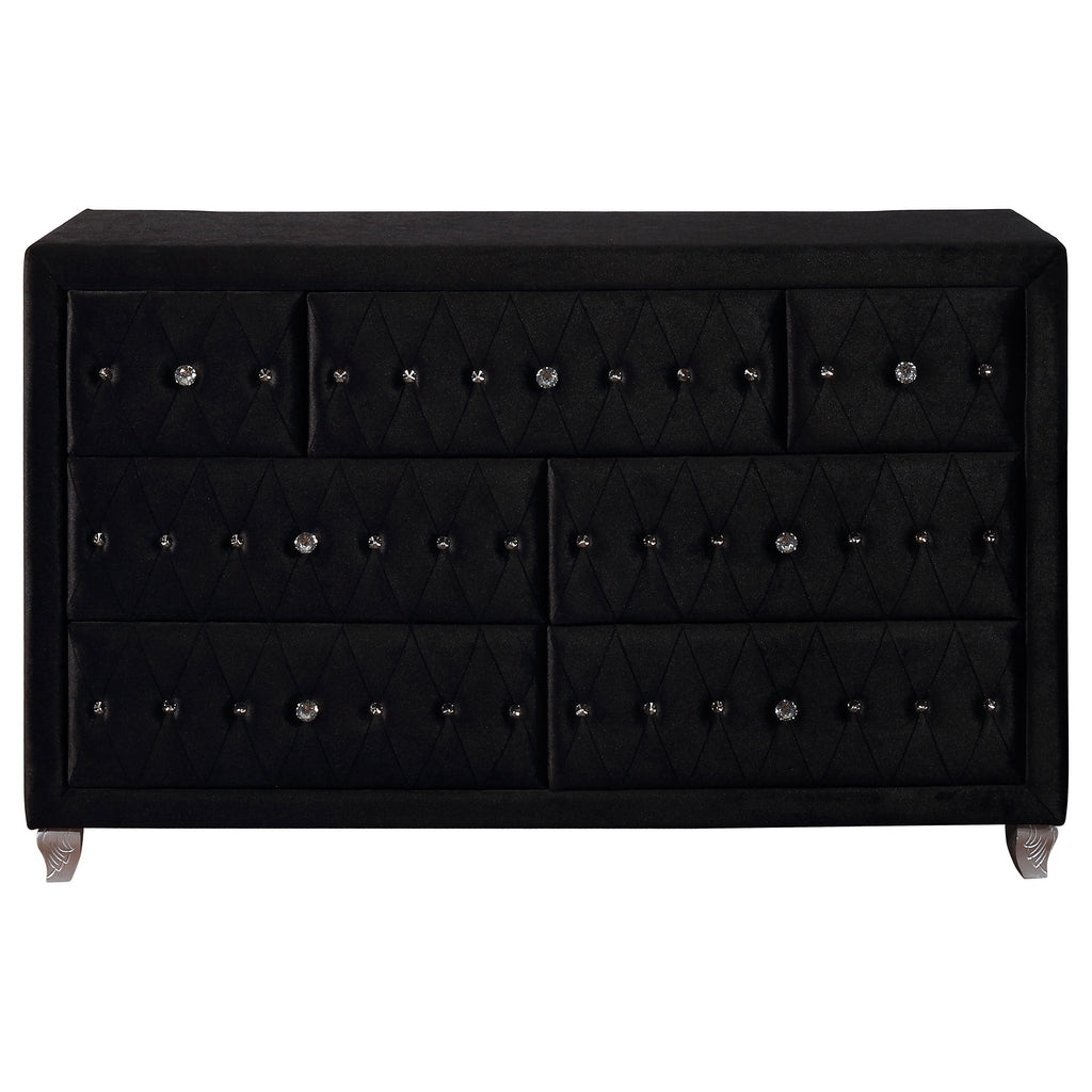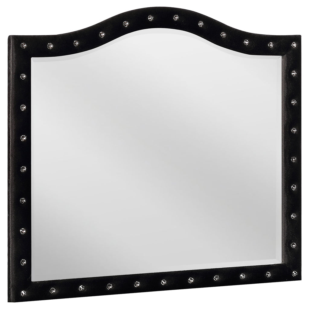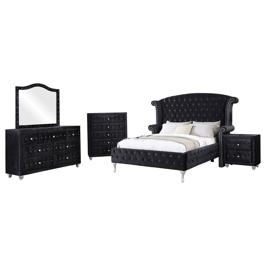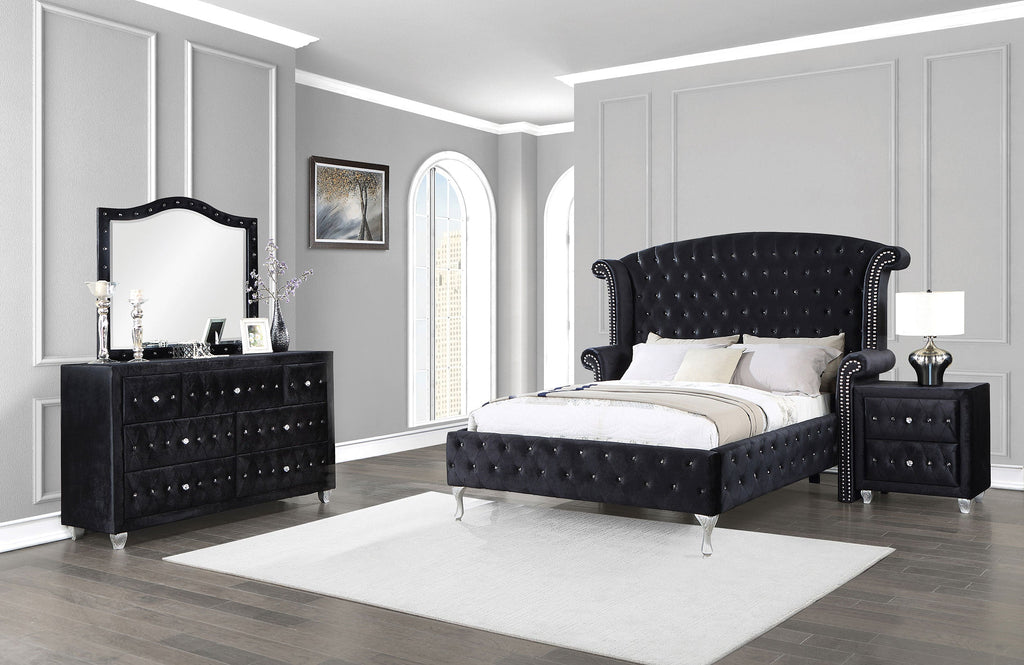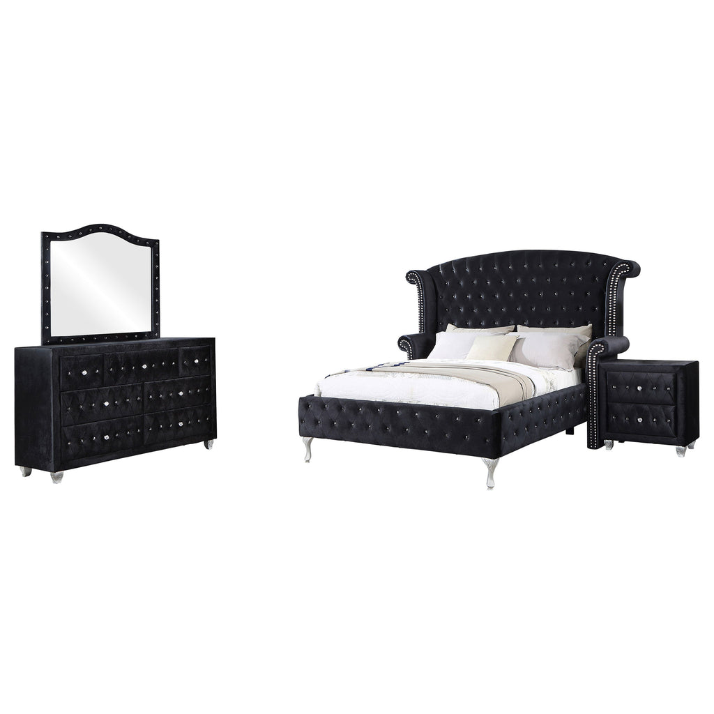 This luxurious four-piece master bedroom set is built with a brilliant metallic finish and elegant black button tufted fabric. The stylish and impressive eastern king bed will turn heads with a nailhead trim that accentuates the rolled headboard and armrests. The meticulously crafted dresser features abundant storage with an assortment of spacious drawers. The night stand has two deep drawers and a table top designed to accommodate a table lamp and a decorative vase. The included dresser mirror is constructed with a slightly curved top that adds a bit of style to complete the look.