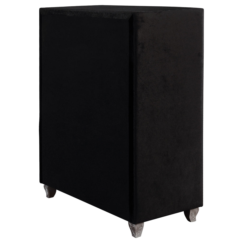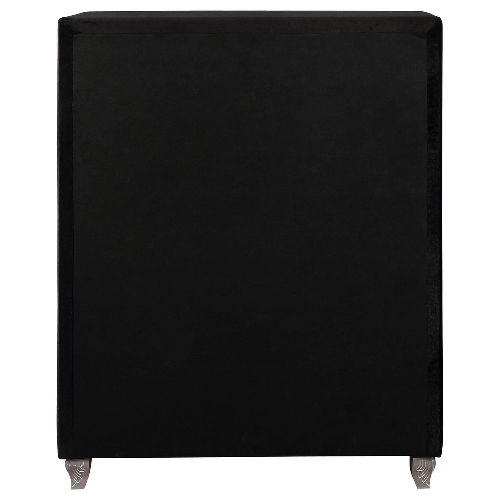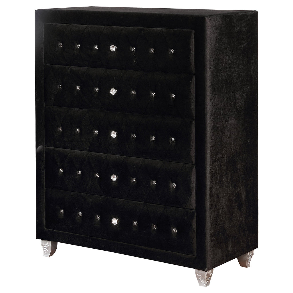 Craft a sophisticated aura in a bedroom with this five-drawer black chest, great for a young fashionista. Adorning the sleek silhouette is luxuriously soft velvet fabric. Crystal drawer pulls and lines of crystal button diamond tufting dress up the drawers. Mirroring the radiance of the bright jewels are curved legs in a metallic finish. Decorate the top with picture frames and your favorite scents.