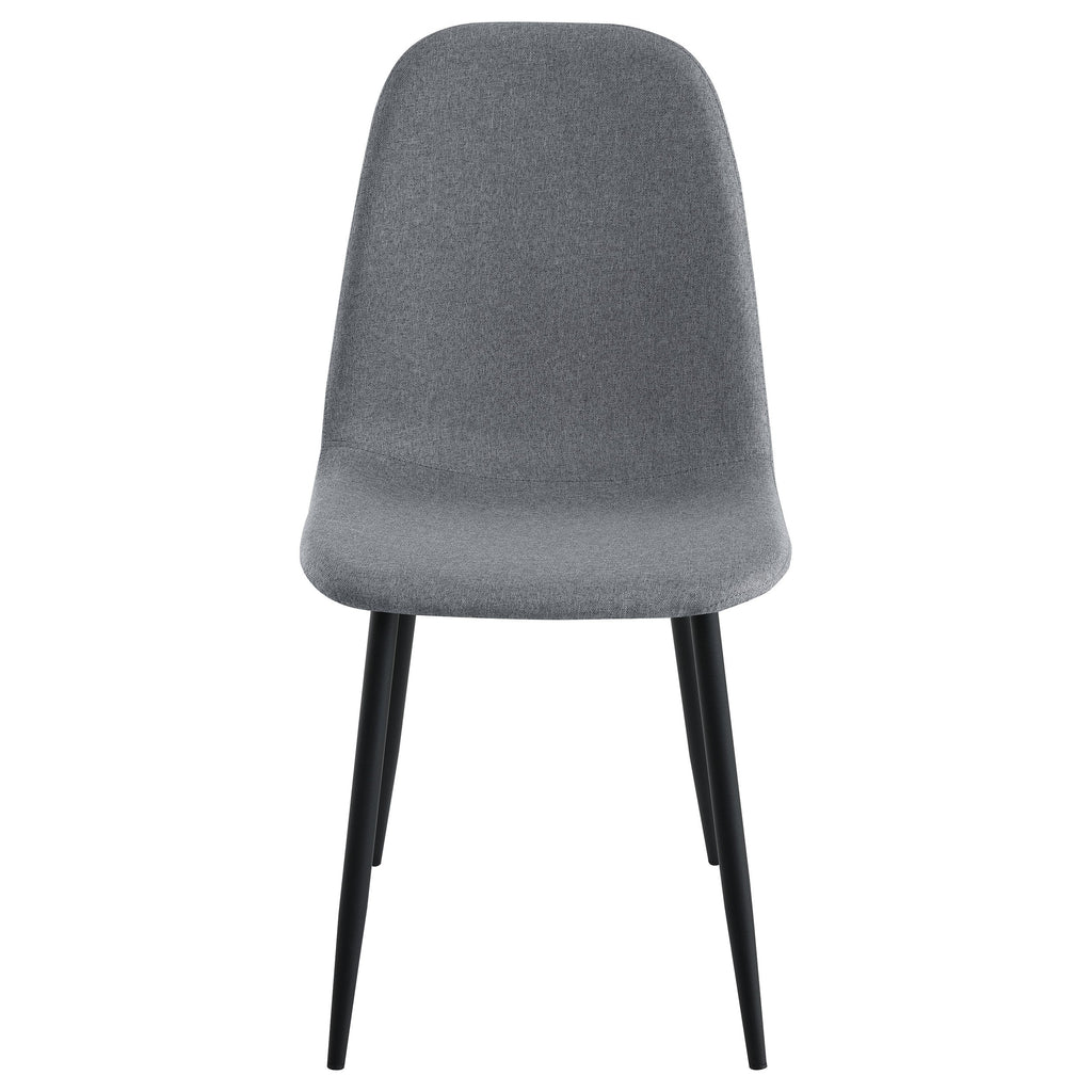 Four side chairs feature grey fabric bucket seats with metal tube legs
