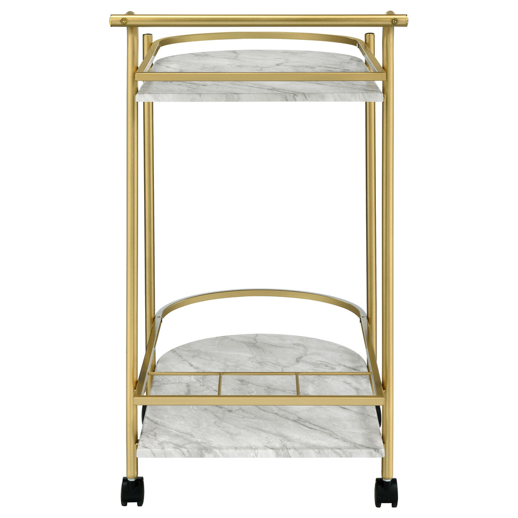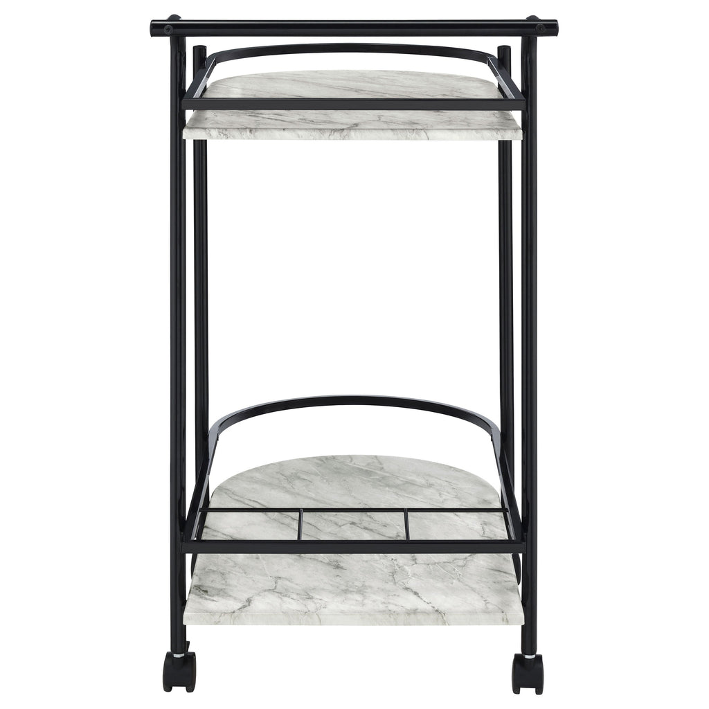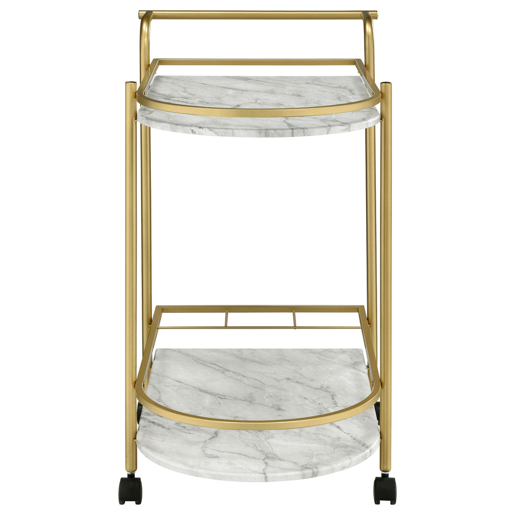 Invite guests over for an intimate soiree and serve up cocktails on this contemporary bar cart. Classic faux white marble shelves stack on top of one another, lending a traditional approach to its sleek modern silhouette. Rounded edges on one side add to the graceful appeal of the elongated shape. Designed in a metal frame with slim railing all around to keep bottles in place, this bar cart is ready to glide across floors. Lockable rolling casters secure it in place.