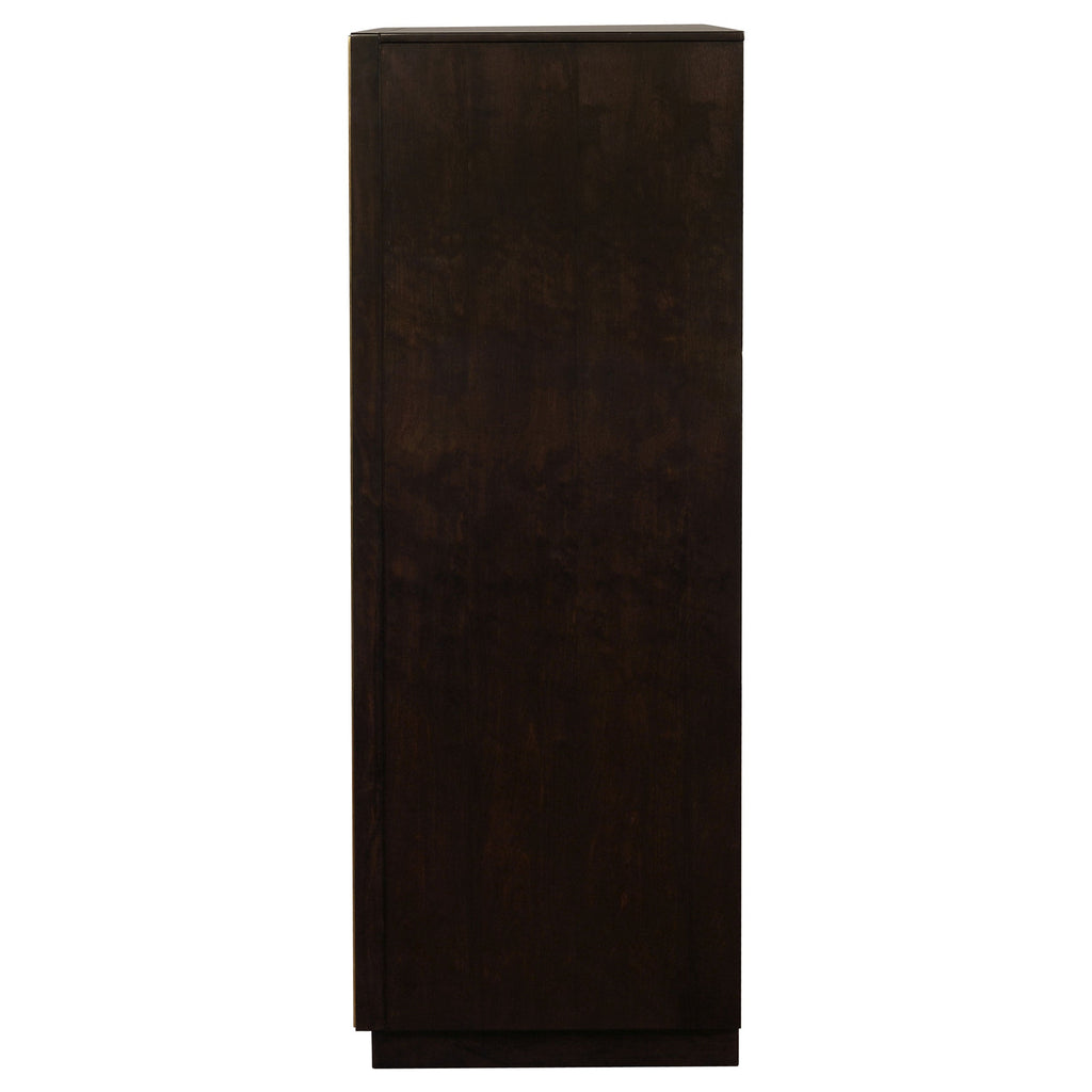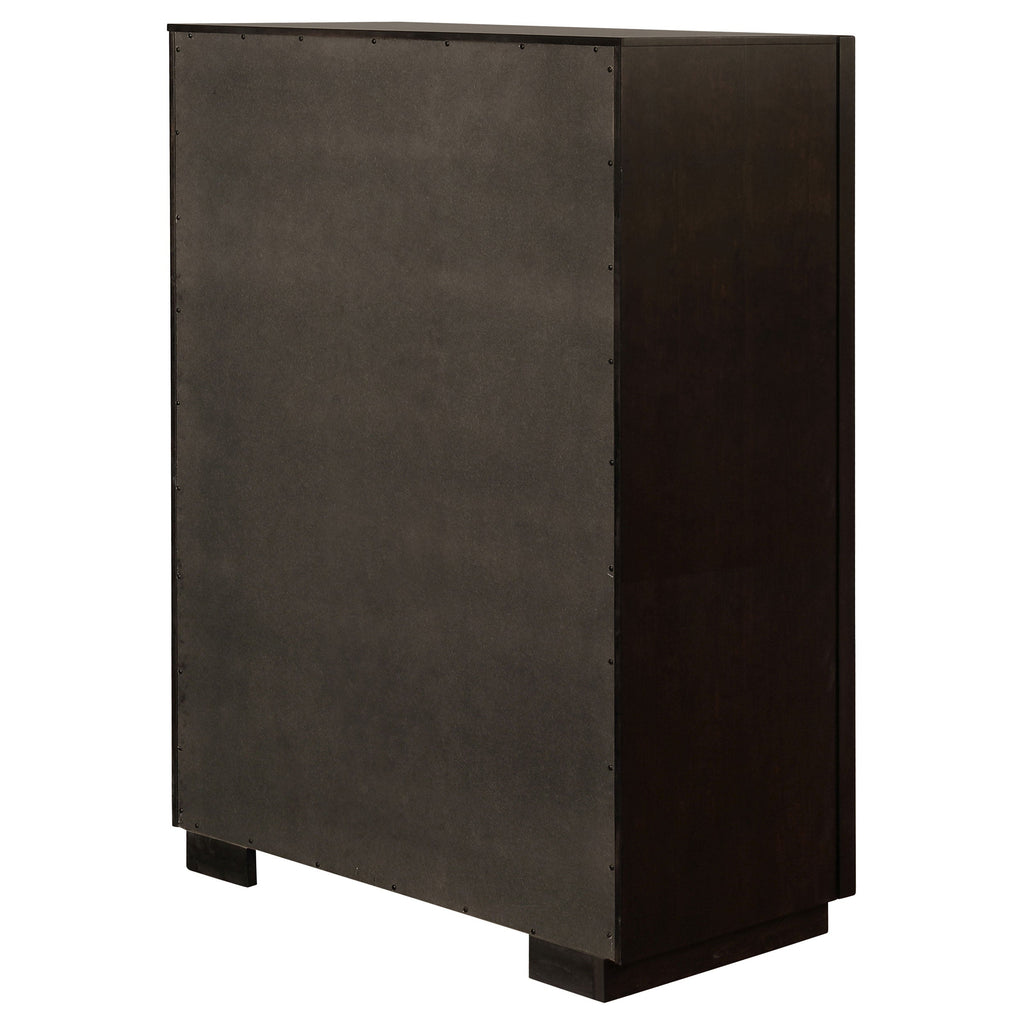 With five spacious drawers, this chest is convenient and versatile. Its large size is ideal for keeping your wardrobe organized. Its strong silhouette is enhanced by an attractive, smoked peppercorn finish. Its long, sleek drawer handles and outer frame are a lovely shade of gold, giving it an eye-catching touch of glamour. With a transitional design, this chest blends seamlessly with a variety of decor styles.