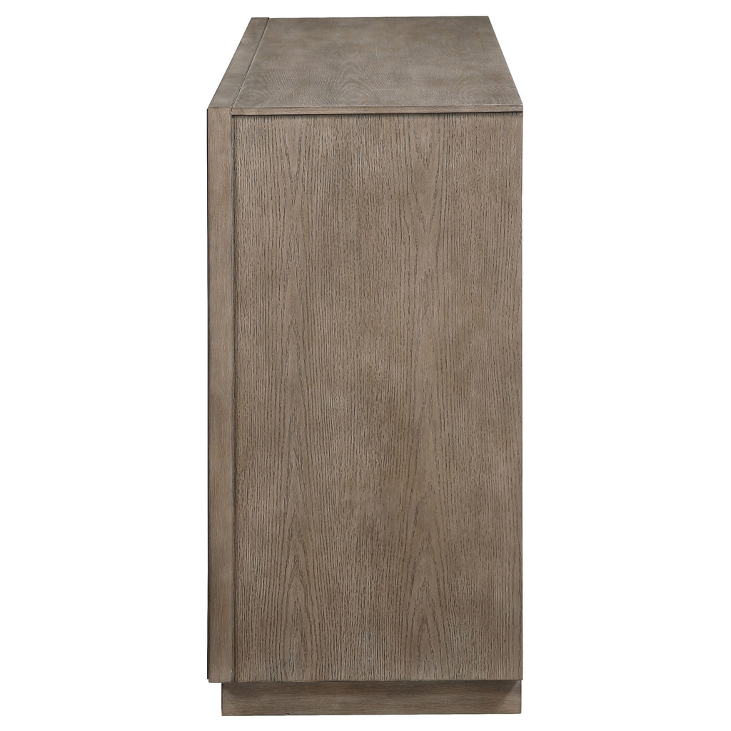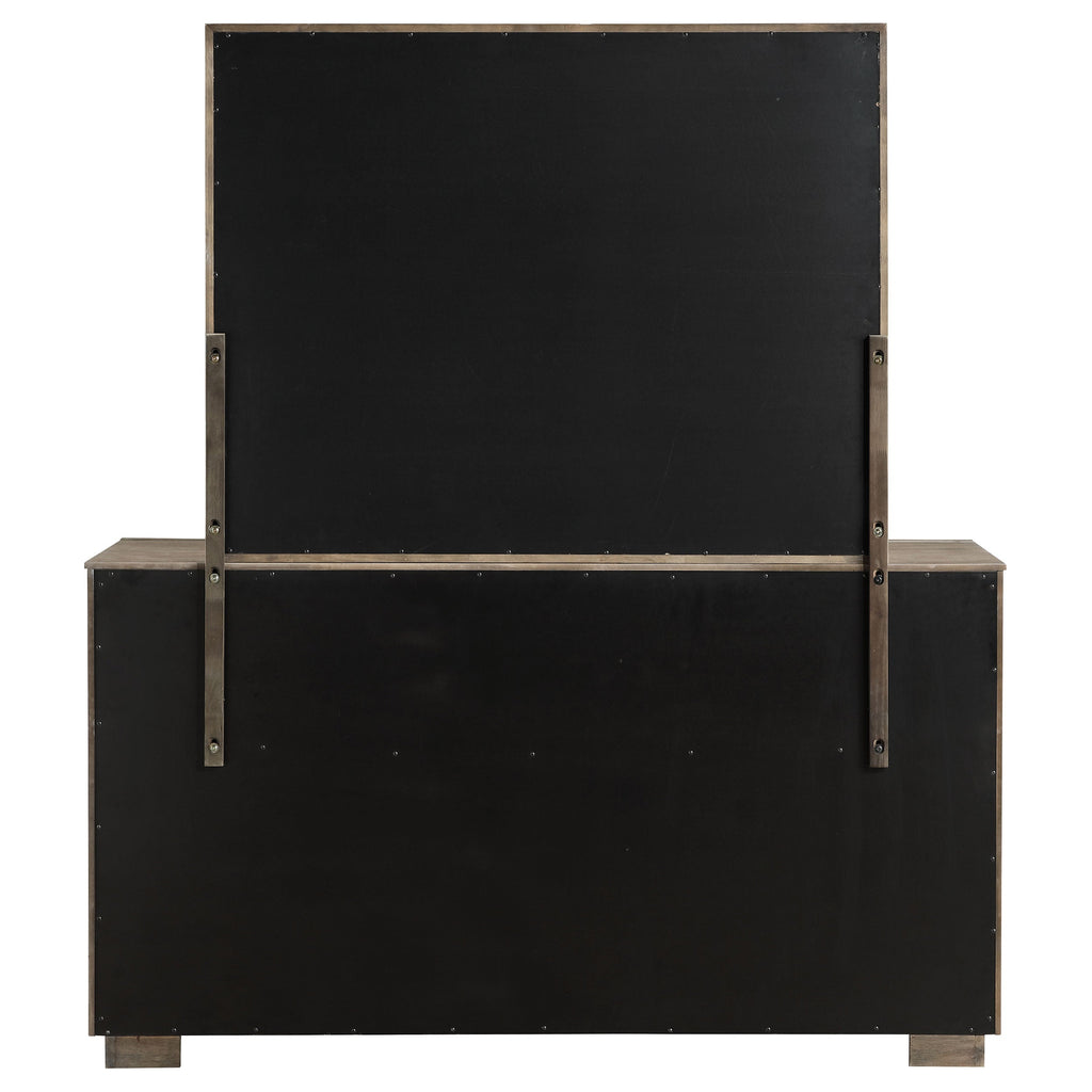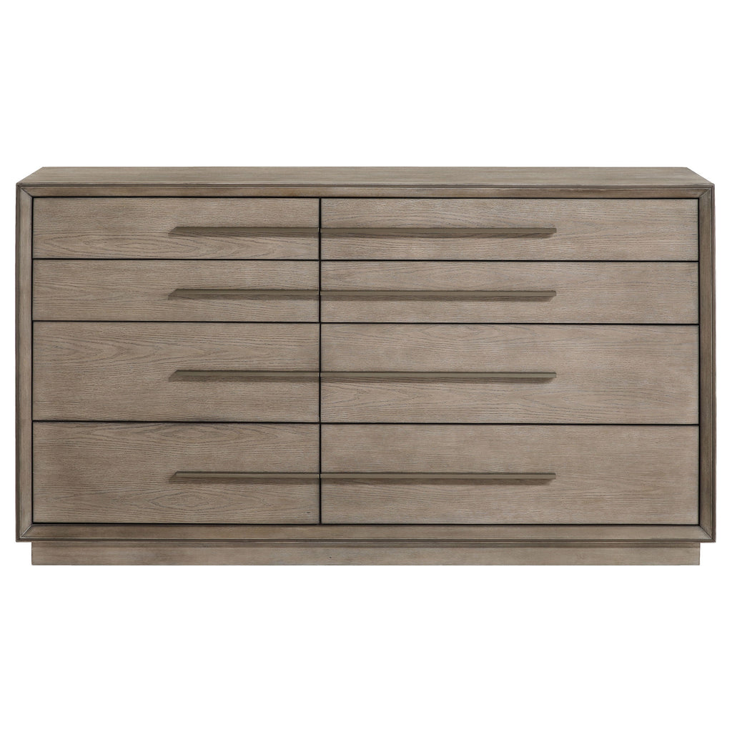 Augment storage and style in your bedroom with a transitional eight-rawer dresser and mirror combination. It features a clean-lined silhouette in a neutral taupe oak wood finish. The front of the case features mitered trim and extra-long bar pulls that highlight an asymmetric center line that creates drawers of different sizes. A wide top is complete with framed mirror, echoing the mitered trim to create a sense of depth and dimensionality. Choose a decor piece or two to inject personalized style.