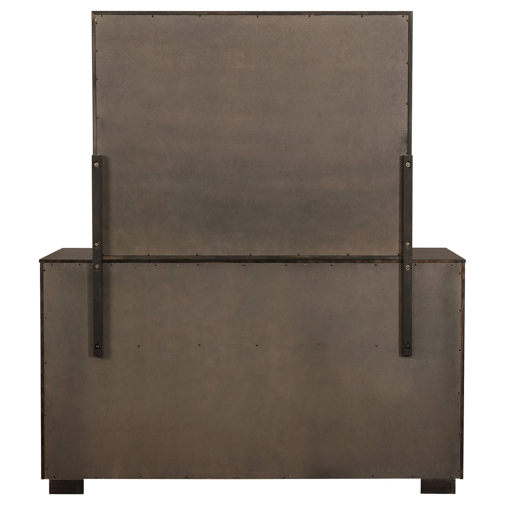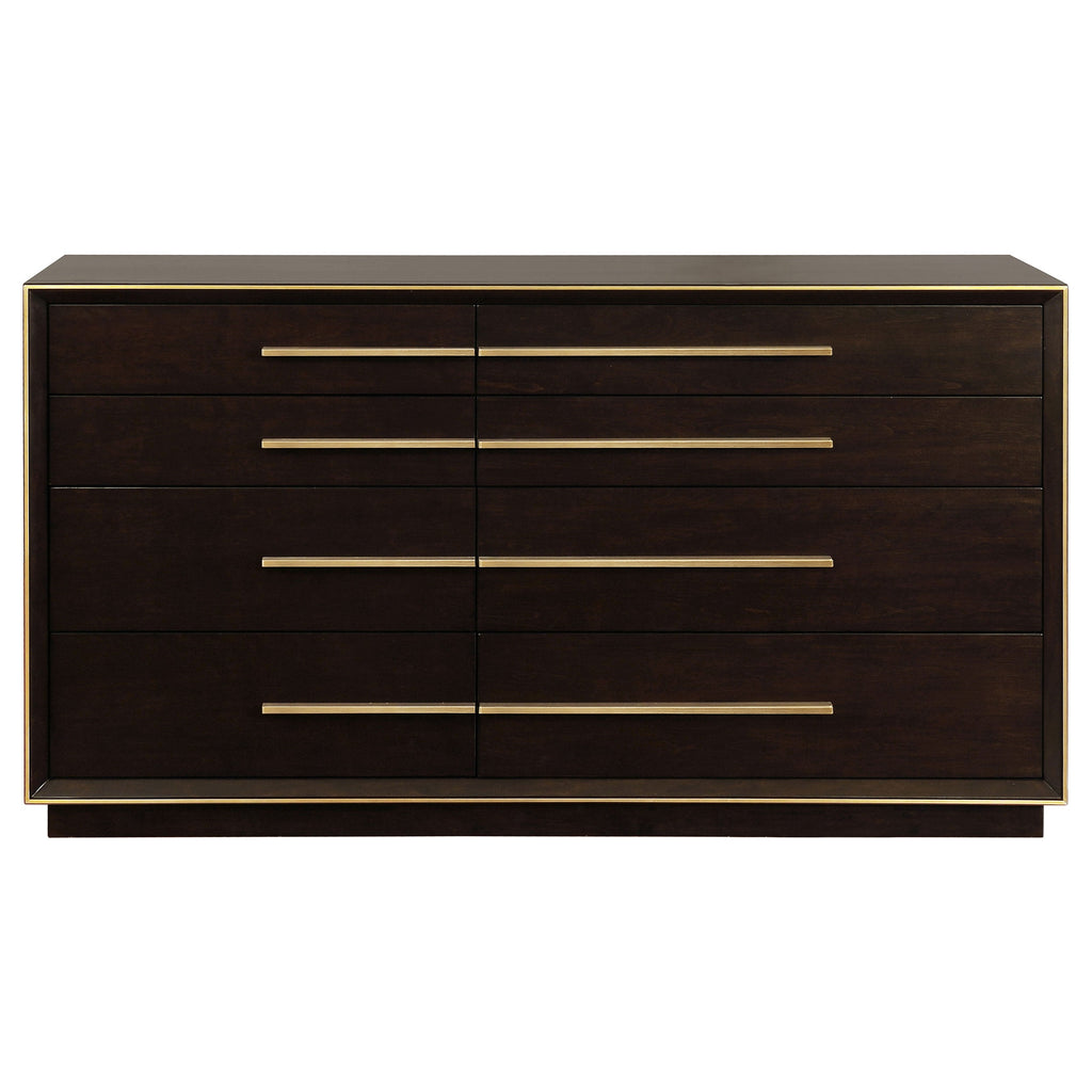Embrace a retro feel in a modern bedroom with this stunning nine-drawer dresser. Elongated metallic drawer pulls protrude from flat drawer fronts, inspiring a sleek look. In a rich and warm smoke peppercorn finish, the deep hues and interesting silhouette create a bold visual. Its simple and smooth profile creates a structured aesthetic, complete with a smooth base that reaches toward the floor. Enhance with a chic perfume collection or a delightful sculptural piece.