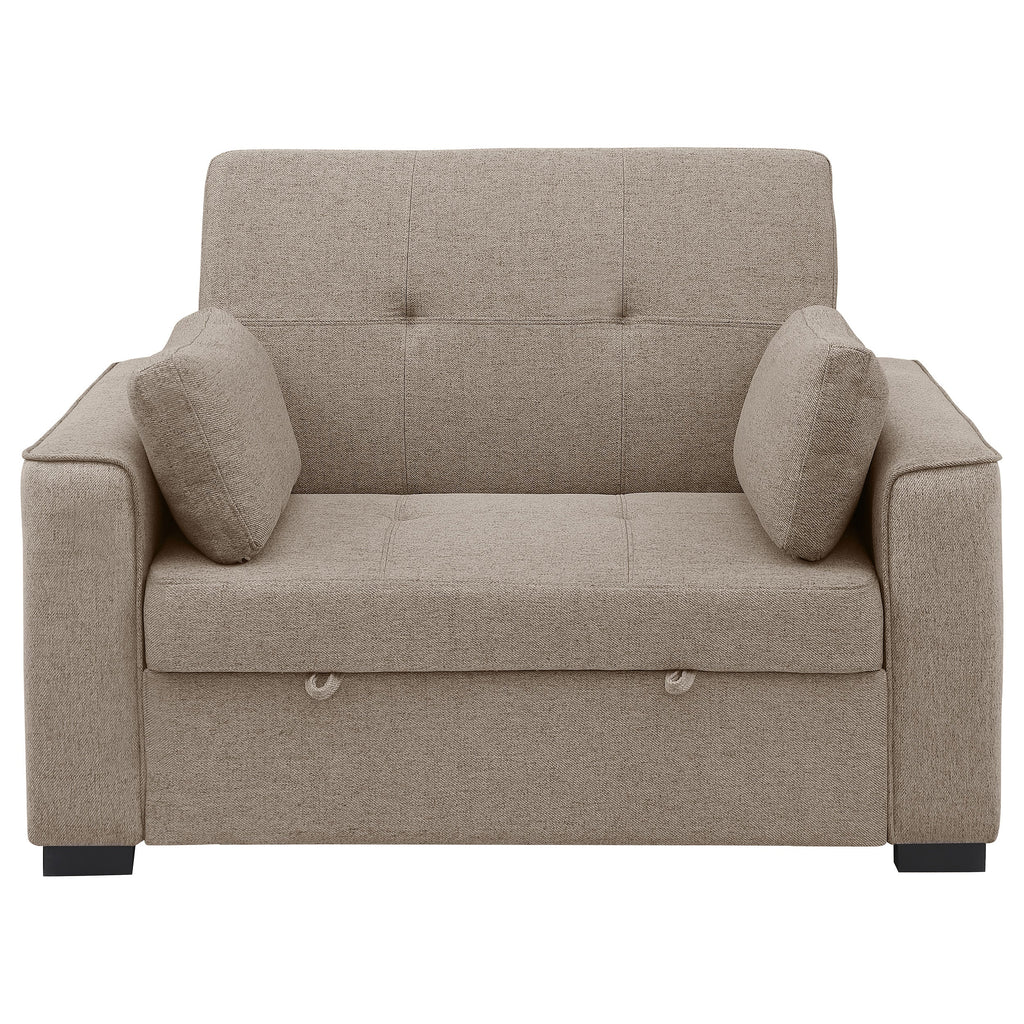 Add flexibility to your home office or living room with a modern sofa bed that doubles as a comfortable armchair. Perfect for guests or lounging, the armchair converts to a single bed, for a comfortable night's sleep. It's neutral upholstery suits in a variety of spaces, while biscuit tufting and piped trim creates a tailored look and feel. The sleeper includes two accent pillows that are ideal for relaxation no matter its configuration. Track arms adds structure and definition to clean-lined design that blends anywhere.