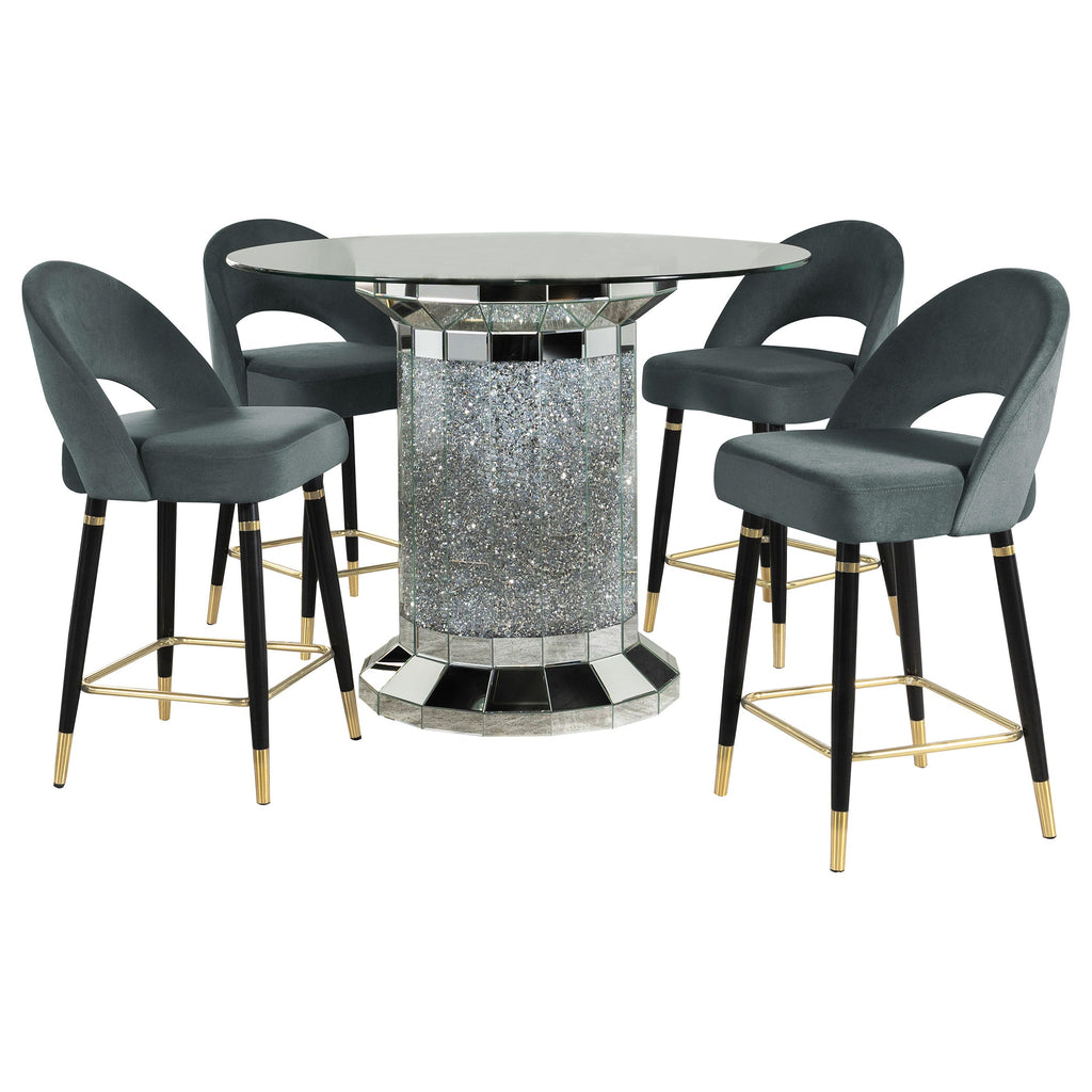 Perfect for contemporary entertainment areas, this chic, modern, glam counter height set hosts four guests comfortably. A round, clear glass top and round, column-inspired pedestal base float elegantly within your spacious room or breakfast nook. The pedestal table base boasts a brilliant faux diamond inlay and mirror tile that shimmers stunningly. Four counter height chairs feature open rounded backs upholstered in soft and smooth velvet for extra comfort and support. Each seat rests on slender legs, complete with golden metallic accents and a sturdy footrest for a dramatic contrast and glam touch.