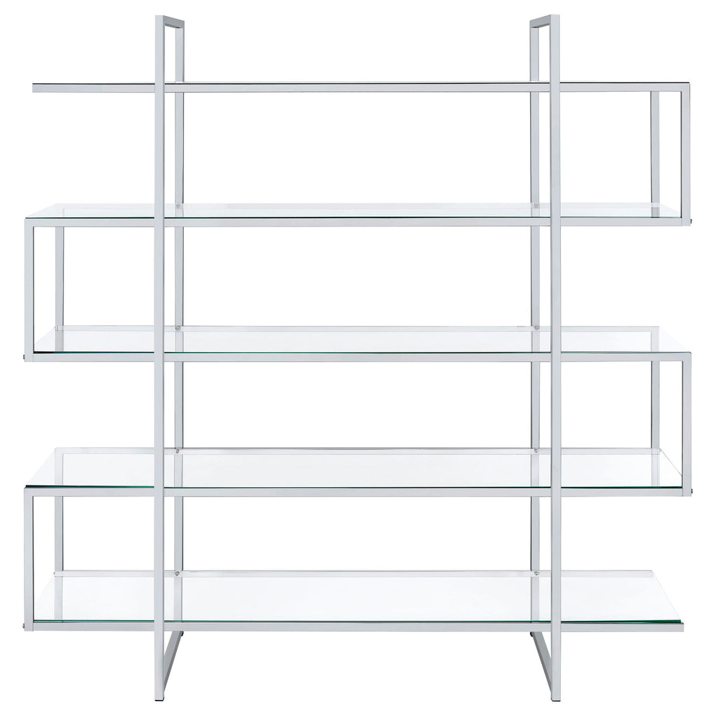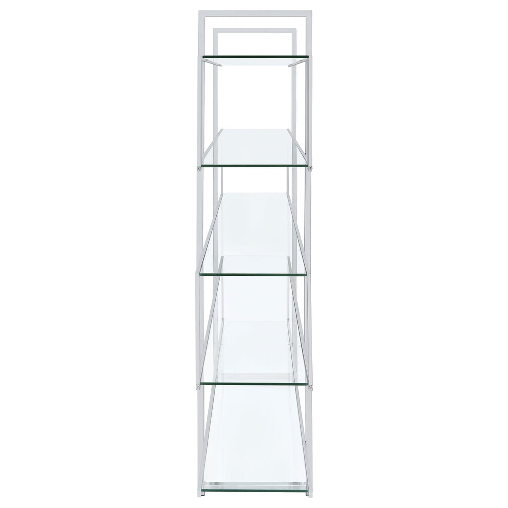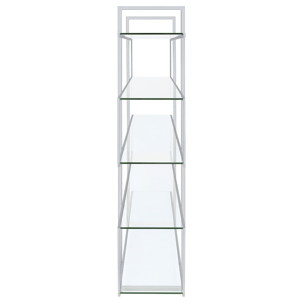 Jump on a trendy, modern bandwagon. Refresh a contemporary space with a stylish piece designed to organize and display. This four-tier bookcase offers a cool profile with personality. Tempered glass shelves blend perfectly with a steel frame. Make room for books, photos, and decor on this edgy, attitude-rich piece.