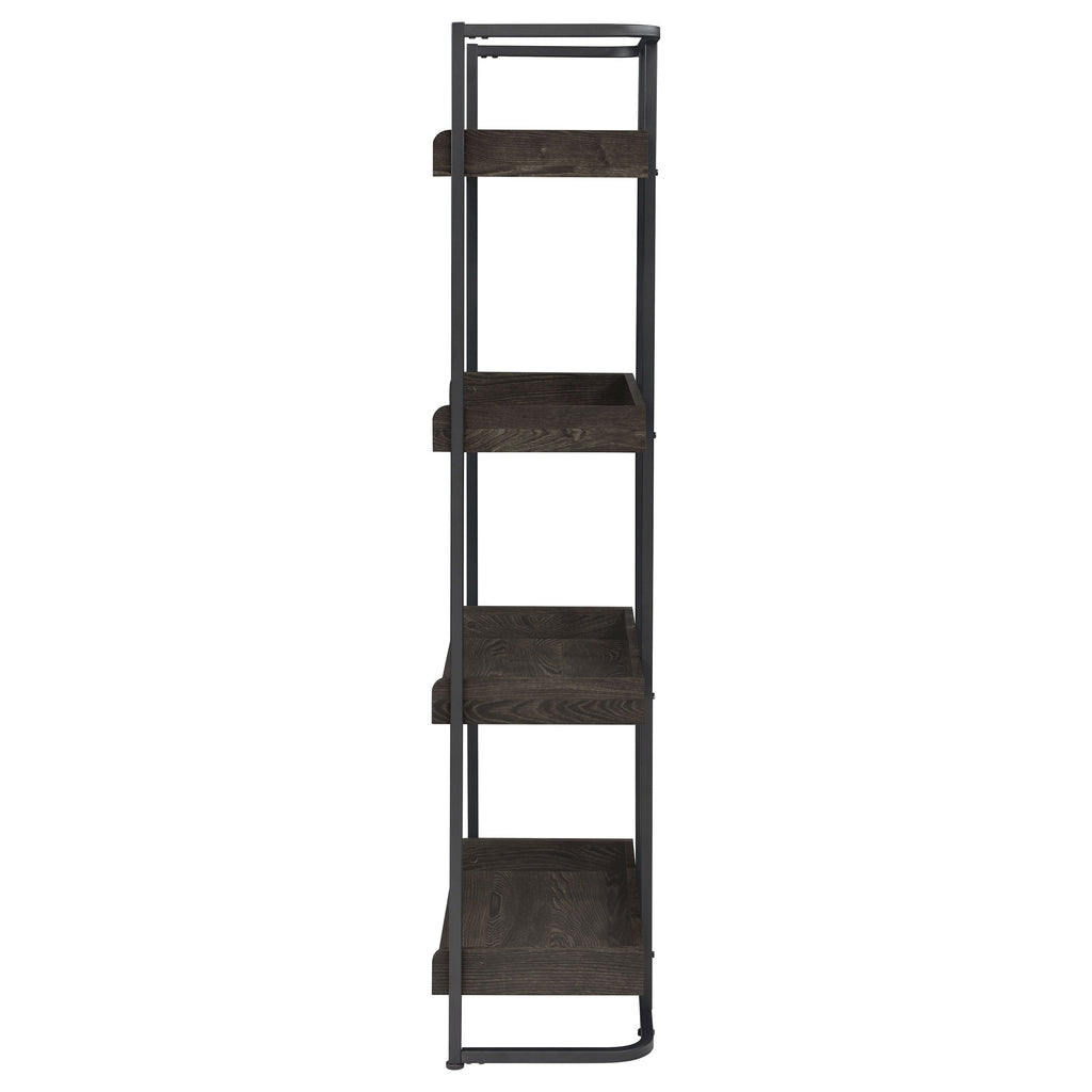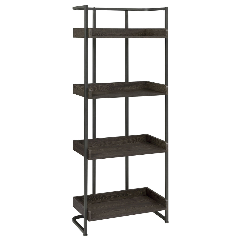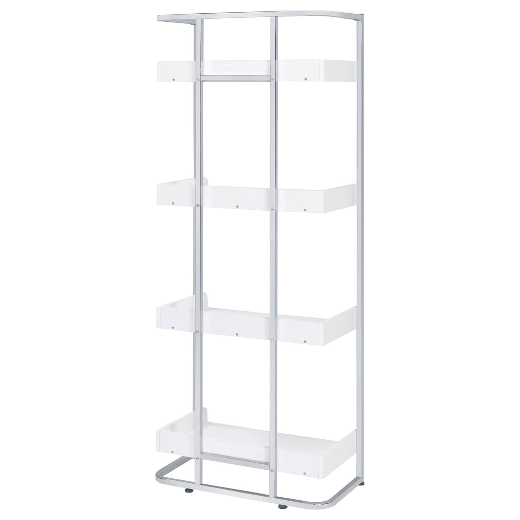 A steel bookcase is bound to steal your heart with its stylish appearance. Four roomy shelves allow for displaying your favorite novels. With its open back design, you'll have no trouble finding the ideal spot in your modern office. Its construction ensures a durable and long-lasting upgrade. This piece is supported on a rounded open base.