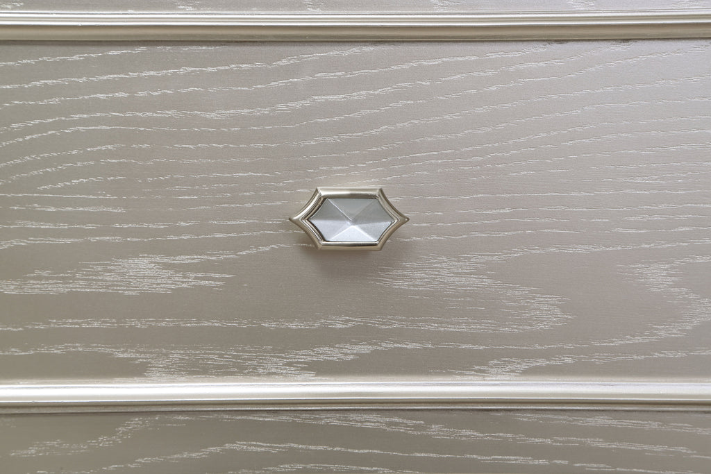Infuse your bedroom with the sophisticated glamour of a gorgeous vanity desk. Delivering everything you need to get red-carpet ready, the vanity is equipped with four spacious drawers, including felt lining on top drawer, and a wide top to spread out all your makeup and hair essentials. On top, a power outlet with USB ports is perfect for charging your phone or Bluetooth speaker to create just the right mood for every occasion. The sophisticated vanity is complete with glittering diamond-like trim, with faceted crystal-style knobs that sparkle in the light. Its soft silver finish is a perfect accent, highlighting a shapely top and elegantly tapering legs to assure utmost glamour and sophistication.