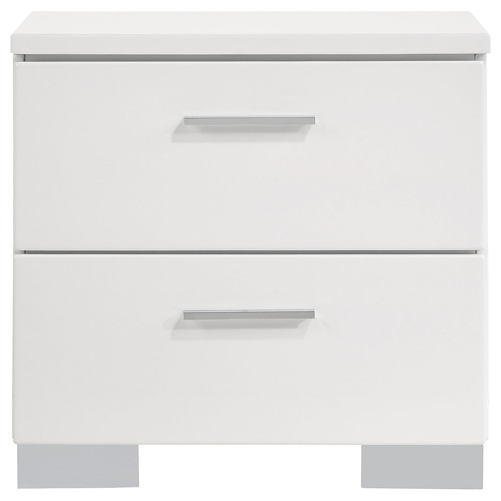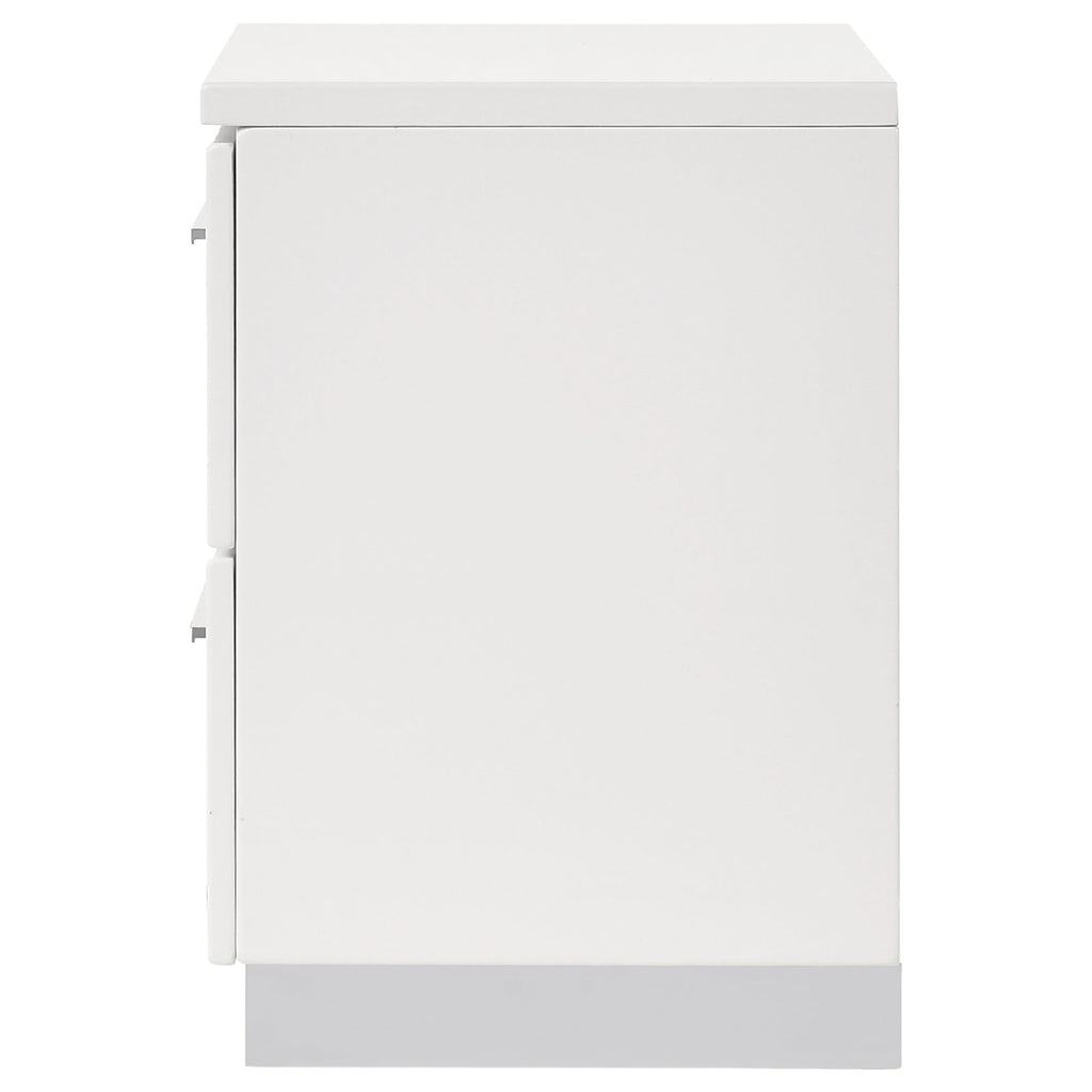 Add functional style to your bedroom with this modern 2-drawer nightstand. Finished in a bright white high gloss, it offers a clean, polished look that complements contemporary interiors. Chrome-finished metal handles and feet provide a refined accent, while metal extension glides ensure smooth drawer operation. Designed for everyday use, this compact storage unit blends durability with a sleek aesthetic.
