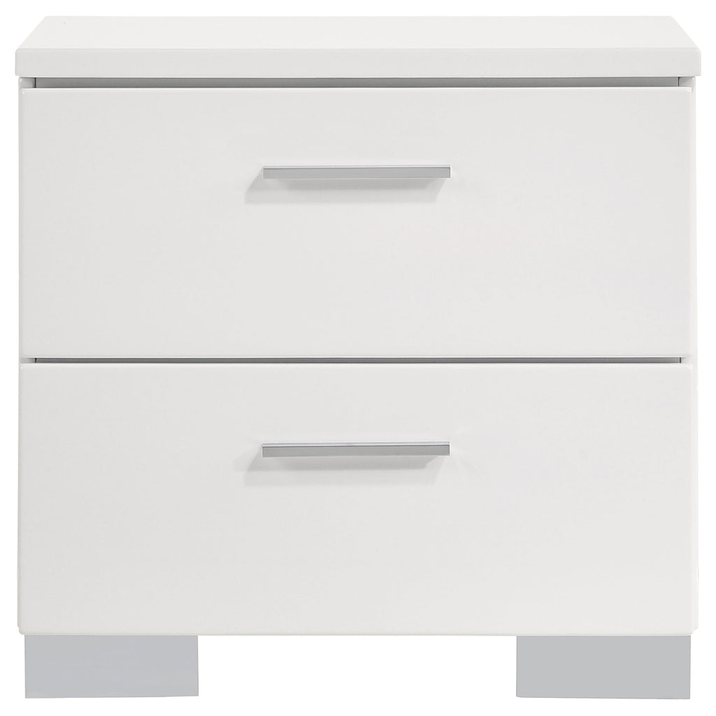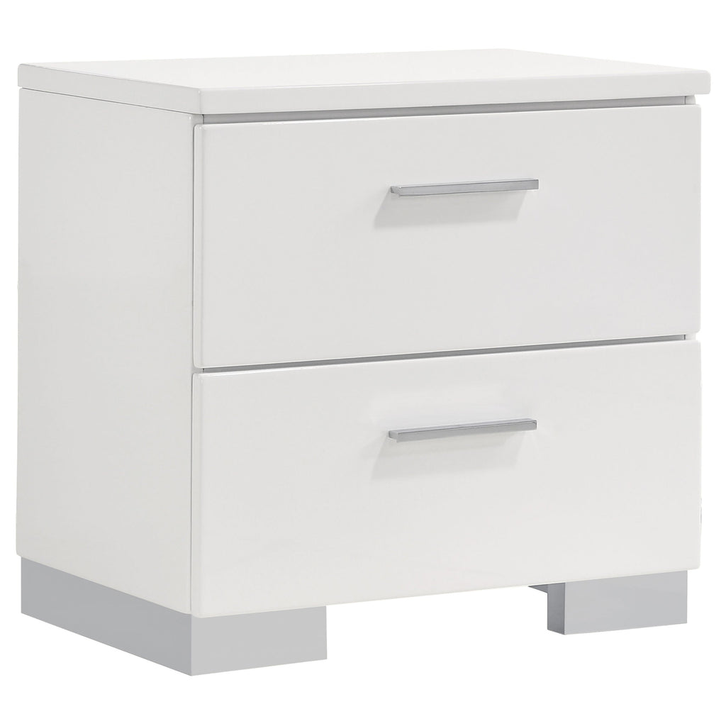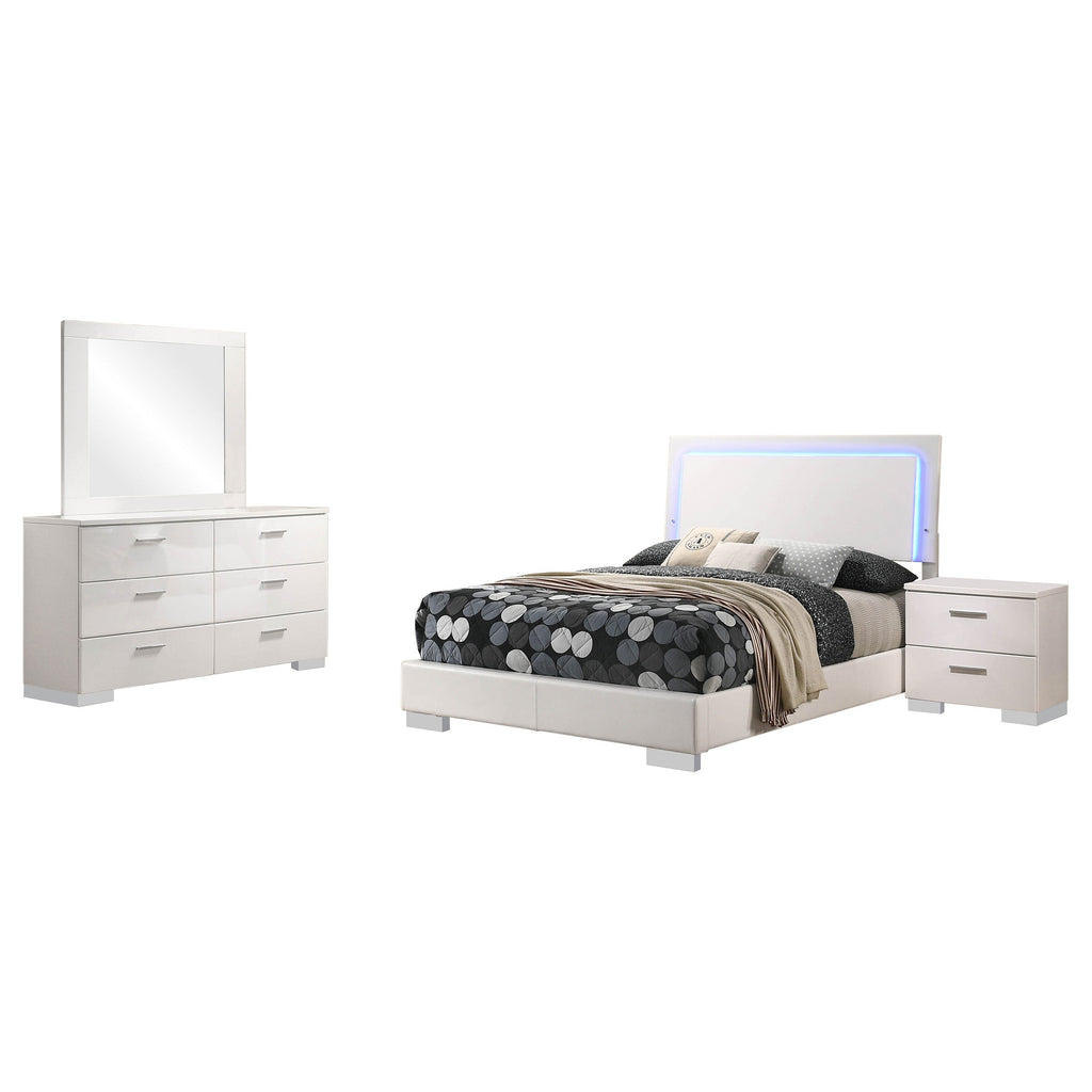Modern design meets ambient lighting in this contemporary bedroom set. The bed features a white high gloss headboard with built-in blue LED lighting, activated by a convenient touch switch. A faux leather upholstered bed frame adds a refined touch, while matching storage elements offer smooth metal glides and chrome-finished details. With clean lines and integrated lighting, this set adds both functionality and visual impact to any modern bedroom.