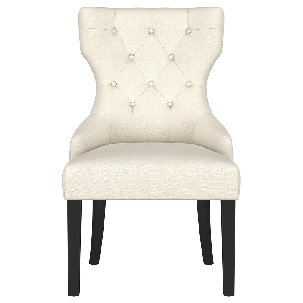 Beige fabric upholstered tufted dining chairs with a classic wingback silhouette provide both comfort and style