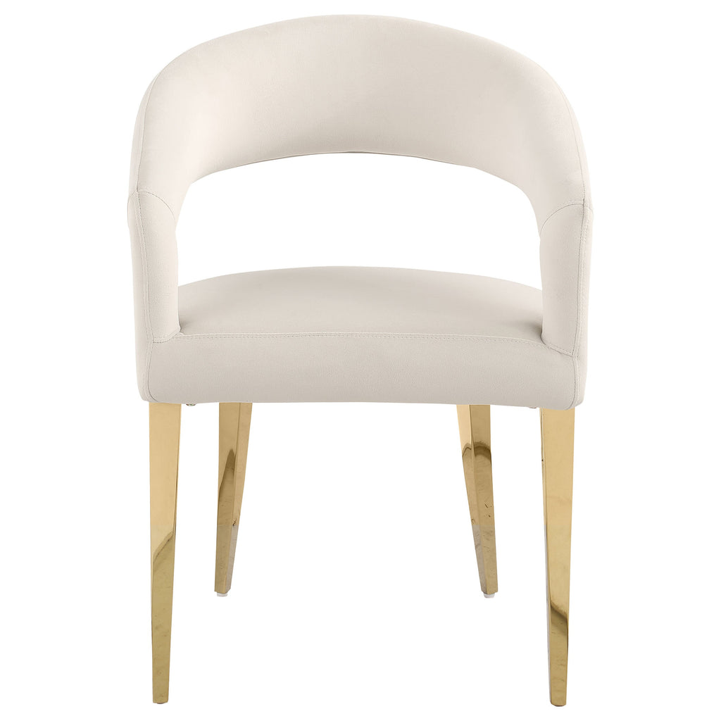 Change the aesthetics of your modern dining room with a refined set of two dining chairs. They're designed with a rounded back and sloping arms with a floating look, creating a sense of open, airy ambiance. The chairs are padded with foam, ensuring excellent comfort, and covered in neutral upholstery for a versatile look that complements in a variety of settings. Champagne finish legs complete the look with gleaming contrast and dimension, perfect for a sophisticated kitchen or dining room. Legs include levelers and glides for smooth performance.
