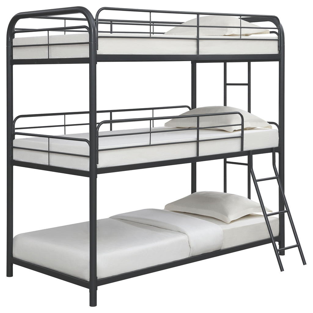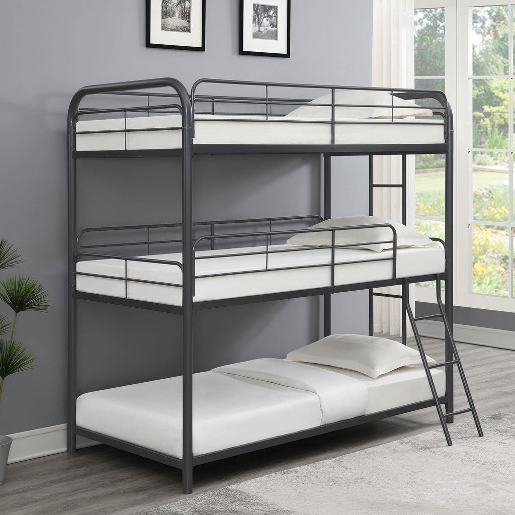 Compact spaces and large families love this triple bunk bed. The modern design is enhanced with clean lines and durable heavy gauge steel construction. Finished in a gunmetal, this stylish triple bunk bed brings function and aesthetics to a youth's bedroom. Find two attached ladders available to access the middle and top bunks. With sturdy guardrails, you will feel peace of mind for the safety of your little ones.
