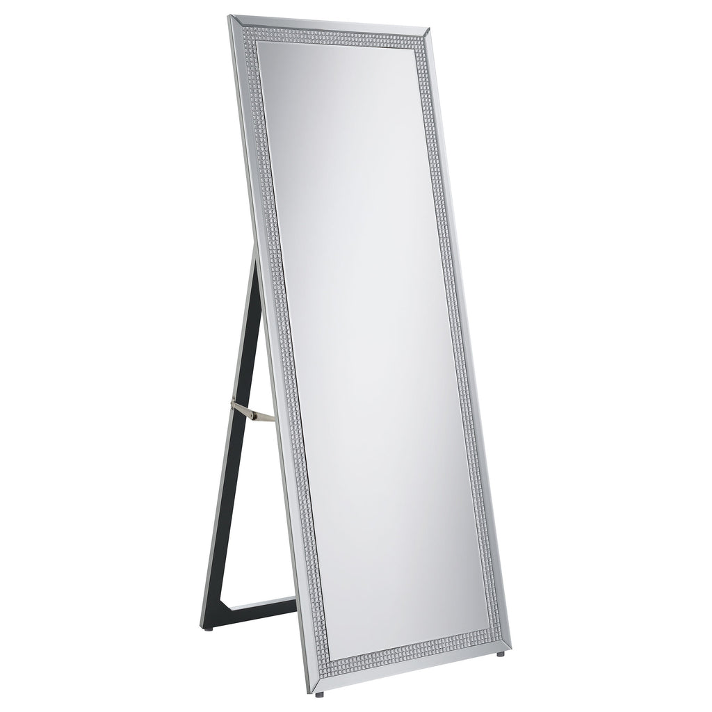 This standing mirror offers a polished balance of function and glamour, framed in sleek mirrored panels with an inset of faceted acrylic crystal inlay. Designed for full-length reflection, its clean rectangular silhouette is supported by an easel back for stable, freestanding use. The crystal trim adds refined sparkle, while the mirrored surface enhances brightness. Perfect for bedrooms, dressing spaces, or closets, this floor mirror brings both clarity and sophistication.