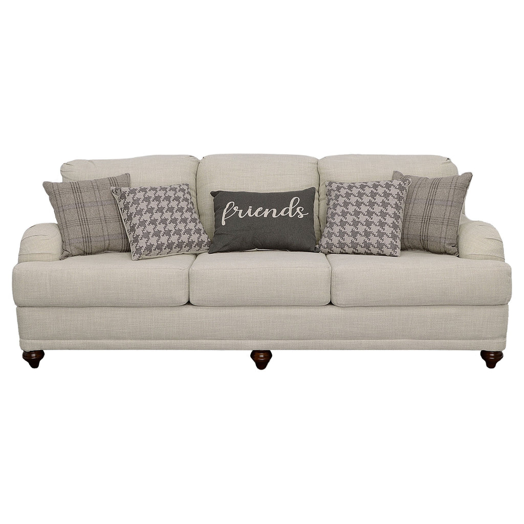 Taking a page from cottage-style farmhouse ambiance, this two-piece sofa and loveseat set wins over family and guests with its elegant simplicity. With tailored English arms and turned legs offering a contrasting espresso finish, each piece of this set shines with a light grey linen-like upholstered cover. Reversible cushions with T-cushions on each end create comfort and stay in shape, as a solid wood frame with a sinuous spring deck sets the stage for durability. Attached back cushions remain stationary to prevent shifting. Enjoy the designer look of seven accent pillows with varying blue print covers.