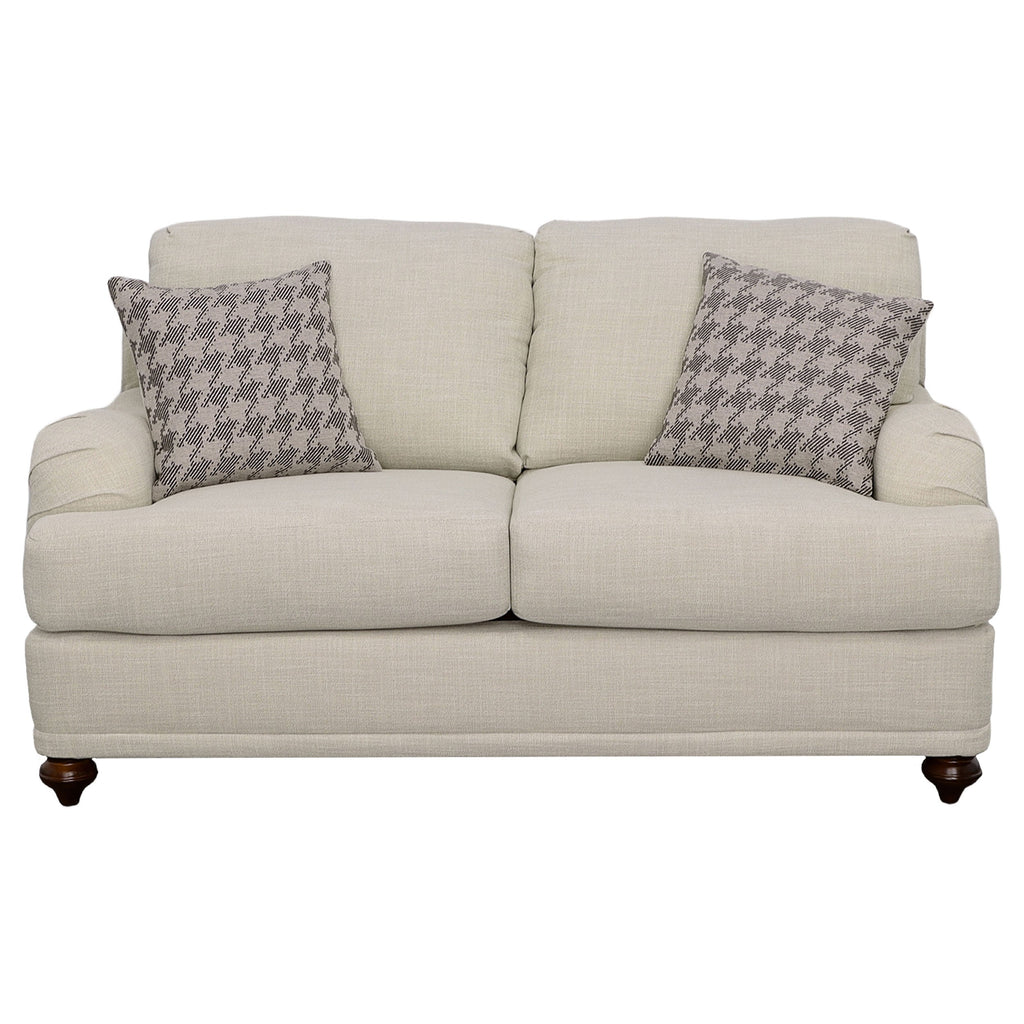 Take advantage of charming farmhouse influence that steers the design of this stylish loveseat. With tailored English arms and turned legs offering a contrasting espresso finish, this loveseat shines with a light grey linen-like upholstered cover. Two reversible cushions T-cushions create comfort and stay in shape, as a solid wood frame with a sinuous spring deck sets the stage for durability. Attached back cushions remain stationary to prevent shifting. Enjoy the designer look of two accent pillows with a houndstooth patterned cover.