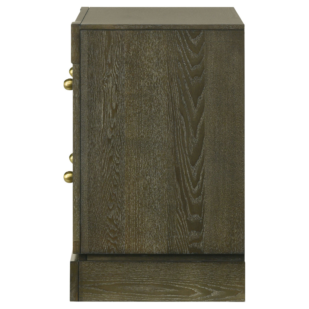 Elevate your bedside with this stylish nightstand, combining transitional design with practical functionality. Finished in dark cocoa with brass knobs, this nightstand features a solid wood drawer box with English dovetail joinery and 45mm metal ball-bearing glides for smooth operation. The top drawer is felt-lined and includes cord management access for your rechargeables. Crafted from solid hardwood, ash veneer, and MDF, this nightstand offers both elegance and durability.