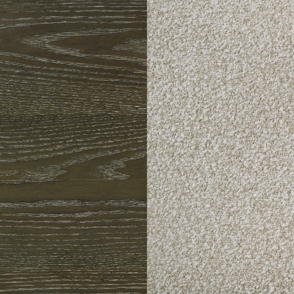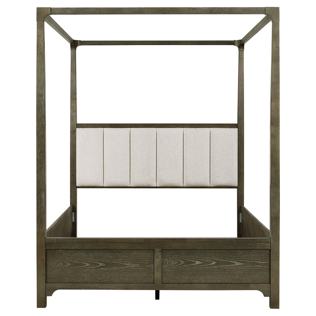 Transform your bedroom into a sophisticated retreat with this transitional canopy bed. Featuring rounded corners and trending design details, this bed offers a perfect blend of style and stability. The headboard is upholstered in textured beige fabric with vertical channeling, adding a touch of elegance. Finished in dark cocoa, the bed is crafted from solid hardwood and ash veneer, ensuring durability and a timeless look. Enjoy the luxurious feel and refined aesthetic of this beautifully designed canopy bed.