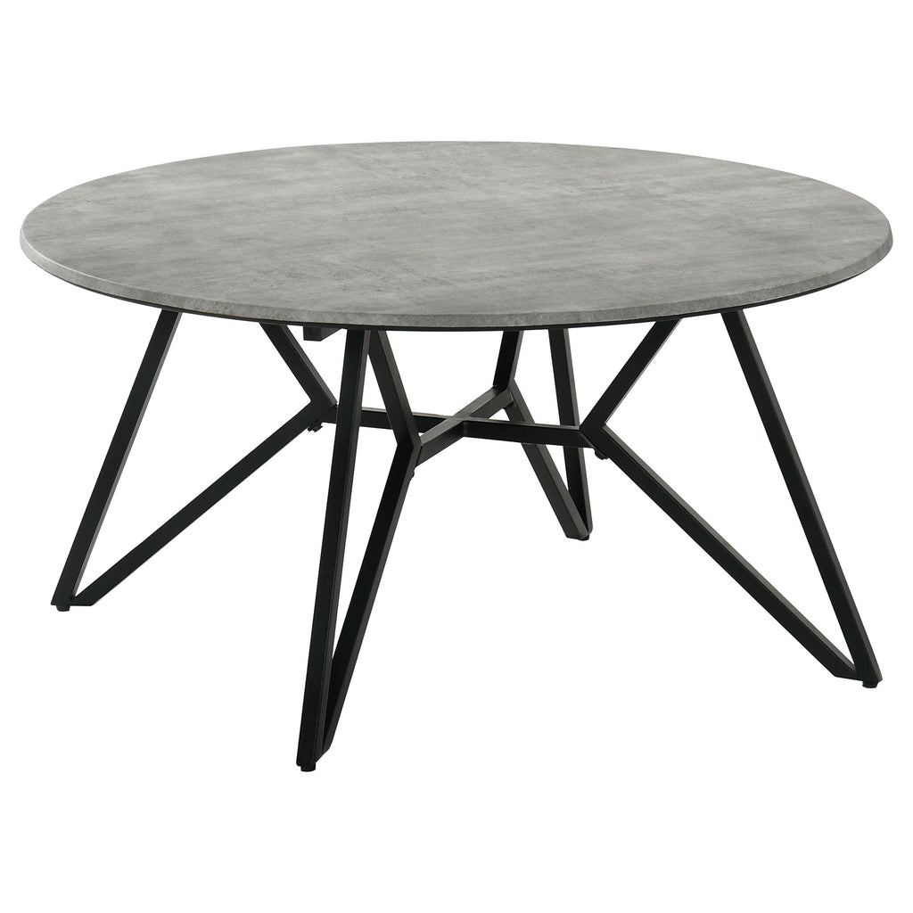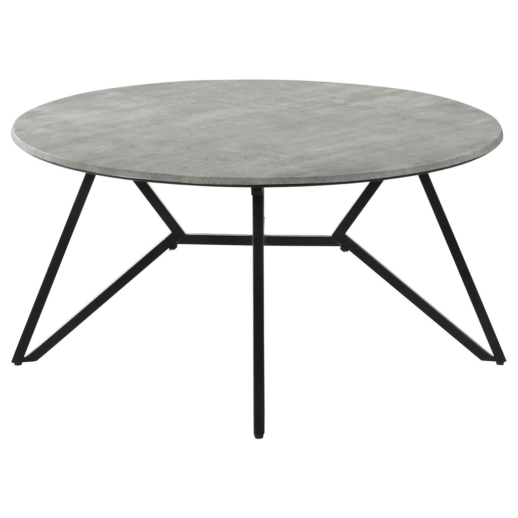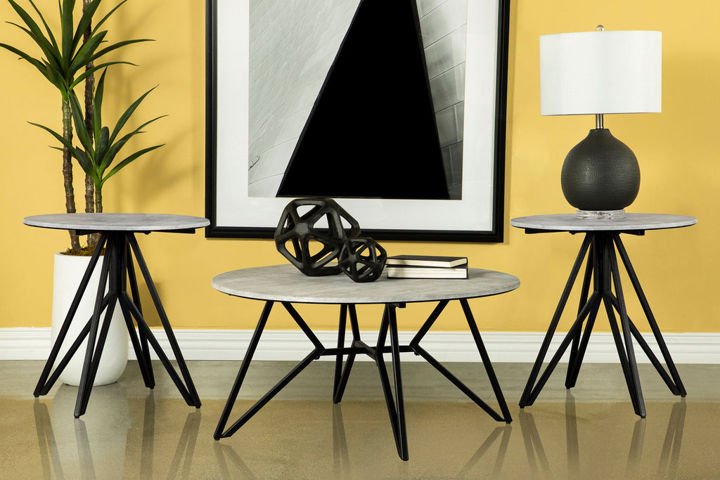 This modern coffee table set features a break-proof and shock-resistant faux cement top with a sandy texture, combining industrial style with practicality. The high-pressure laminate surfaces resist stains, UV light, scratches, and cigarette burns for exceptional durability. Gunmetal-finished metal bases with striking geometric designs provide stability and a sculptural aesthetic. Perfect for modern and minimalist interiors, this occasional table set adds functionality and style to your living space.
