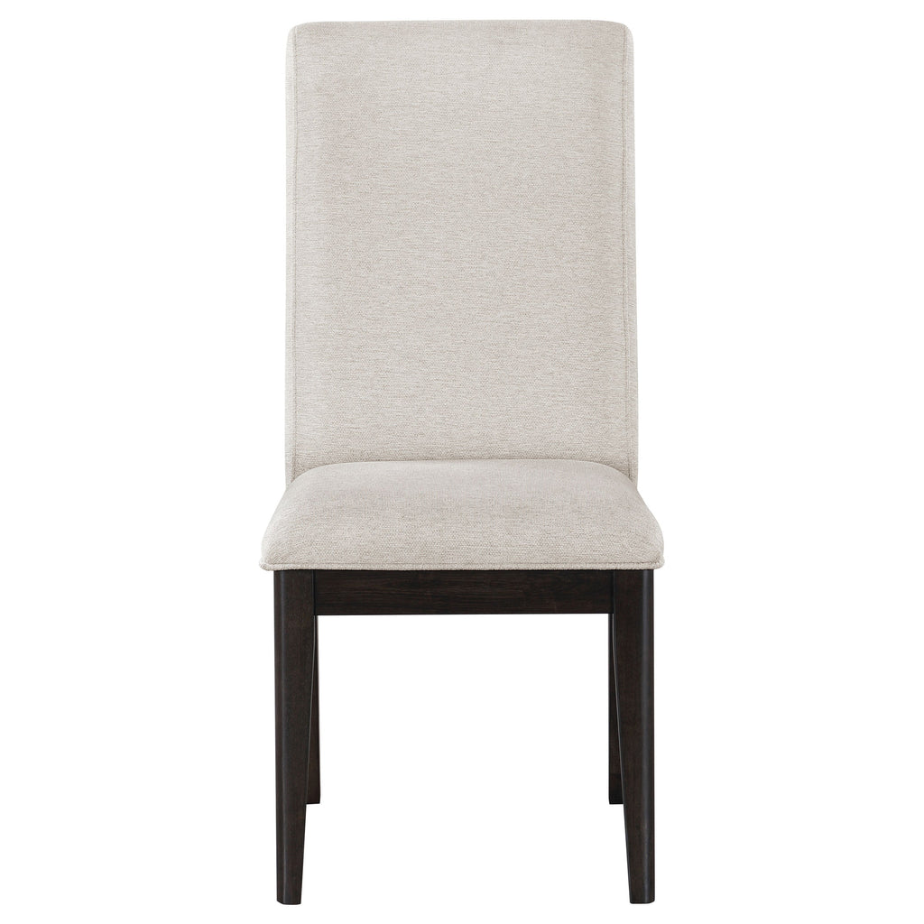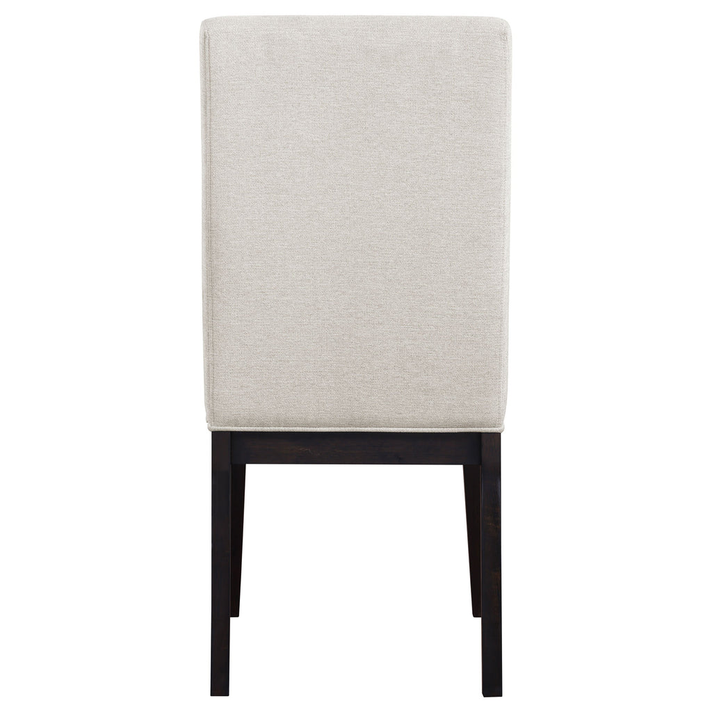 Revamp the look of your kitchen or dining room table with a set of two modern side chairs. Each boasts strong, durable construction with Asian hardwoods and MDF paired with acacia veneer. A dark brown finish complements the frame, which includes straight legs with a hint of angularity for excellent comfort. A tall back and comfortable seat are complete with foam cushioning for support. Cream upholstery is a crisp complement, offering contrasting elegance and character that stands out.