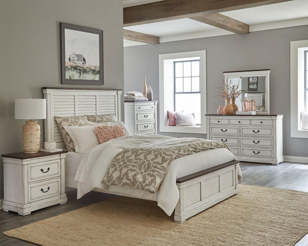 Achieve your dream of a country chic bedroom suite with this four-piece set. A lovely panel bed with a shutter-style headboard is the main attraction while the footboard is crafted with a solid panel design. Crown molding enhances all pieces, including the two-drawer nightstand, nine-drawer dresser, and mirror. The storage items are equipped with self-closing glides for your convenience. The entire set is tied together with a white finish and striking dark rum accents for a two-tone theme.