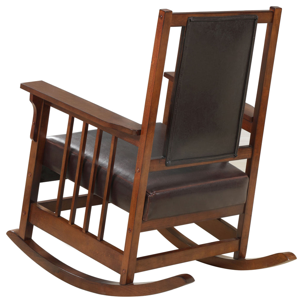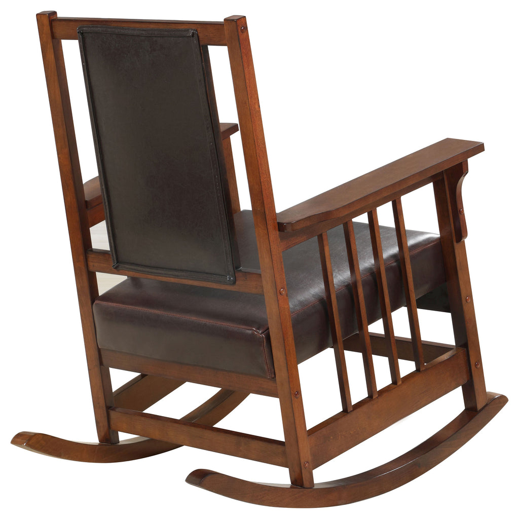 Easy, relaxing motion is always a pleasant experience, and this rocker chair offers comfort as well as aesthetics. With a hint of mission styling, its linear silhouette captures attention. Perfect for a transitional space, its lush tobacco finish tobacco finish frame and split leather and PVC padded seat and back make a gorgeous pair. Enjoy a fluid movement from a rocker base. This beautiful chair is a solid choice for a study or den.