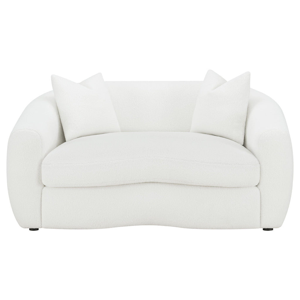 Transform your sophisticated modern living room with this vintage-like contemporary natural loveseat, featuring boucle upholstery that presents an inviting cloud-inspired resting place. Gracefully curved armrests, a single bench cushion, and a tailored backrest complete this retro-inspired look, accented by black legs.