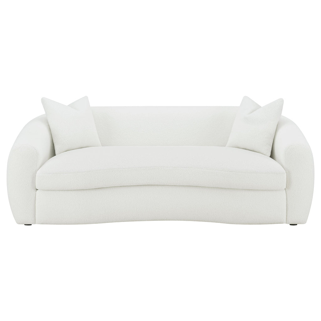 Create your inviting living room with this contemporary natural sofa, upholstered in boucle upholstery throughout its gracefully designed, contoured silhouette and elegantly sloped armrests. Matching accent pillows with premium faux down fill offer extra coziness and comfort to the curved bench cushion and tailored backrest.
