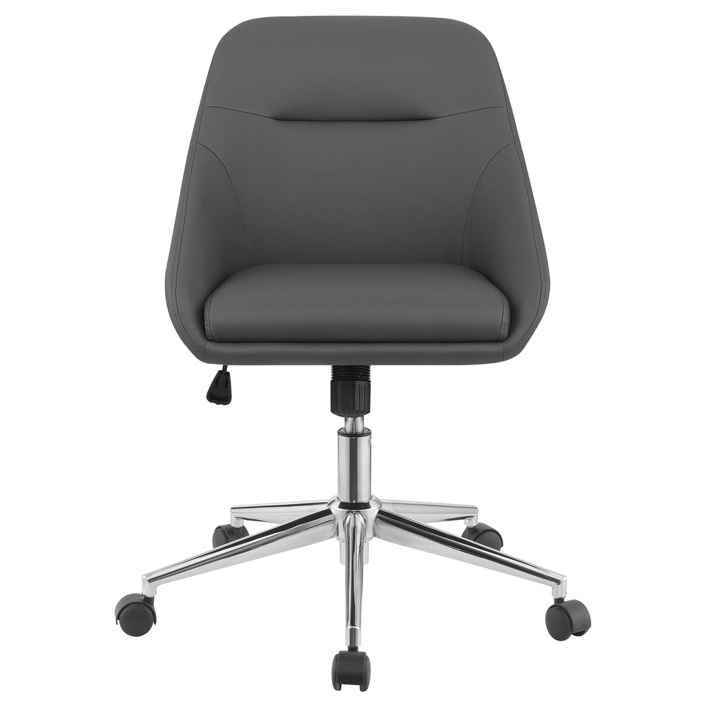 Wrapped in soft and smooth leatherette, this modern office chair features contoured edges for an elegant, contemporary silhouette. Lean against the supportive, comfortable backrest as you focus on work and other tasks. The seating also features a pintuck design and sloped armrests that lend a clean look that is easy on the eyes. Supported by a five-caster wheelbase in a polished chrome finish, this office chair glides across the floor to retrieve office supplies and effortlessly slides beneath a desk at the end of the day. A pneumatic lift also allows you to adjust the height for a more ergonomic seating position.