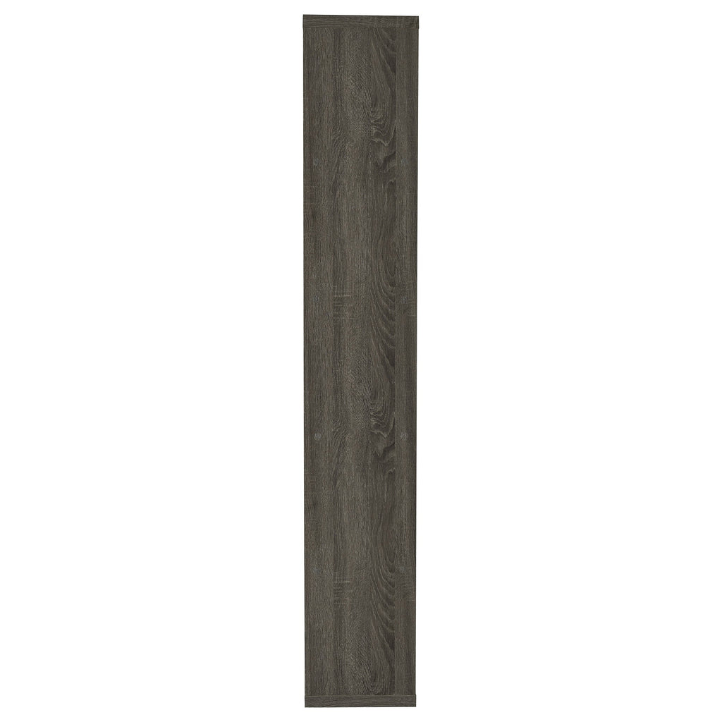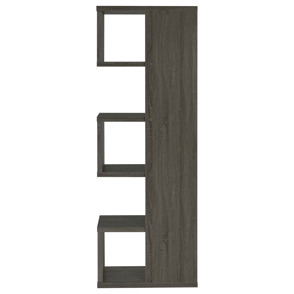 Purposeful imbalance tells a story. Designed with a whimsical profile, this bookcase brightens up a contemporary space. A visually pleasing arrangement of five tiers creates shelf space for books and decor. Finished in a cool weathered grey, it provides versatility and design power. Make this bookcase a focal point in a home office or casual room.