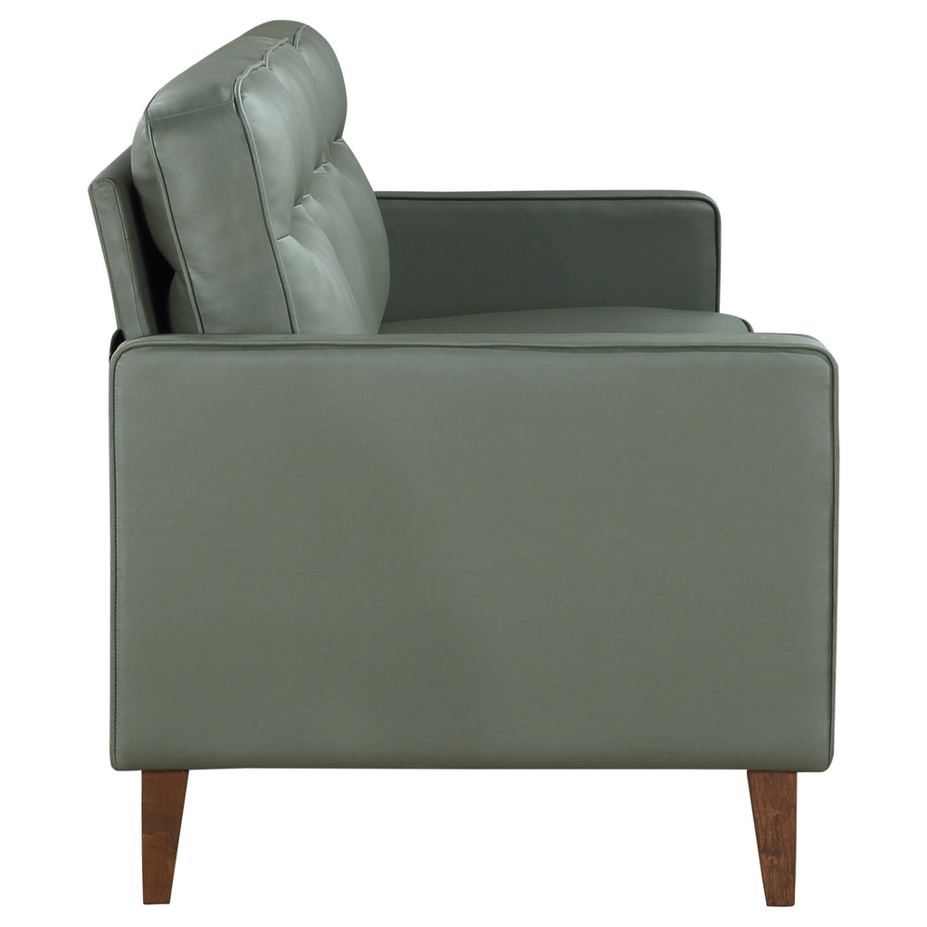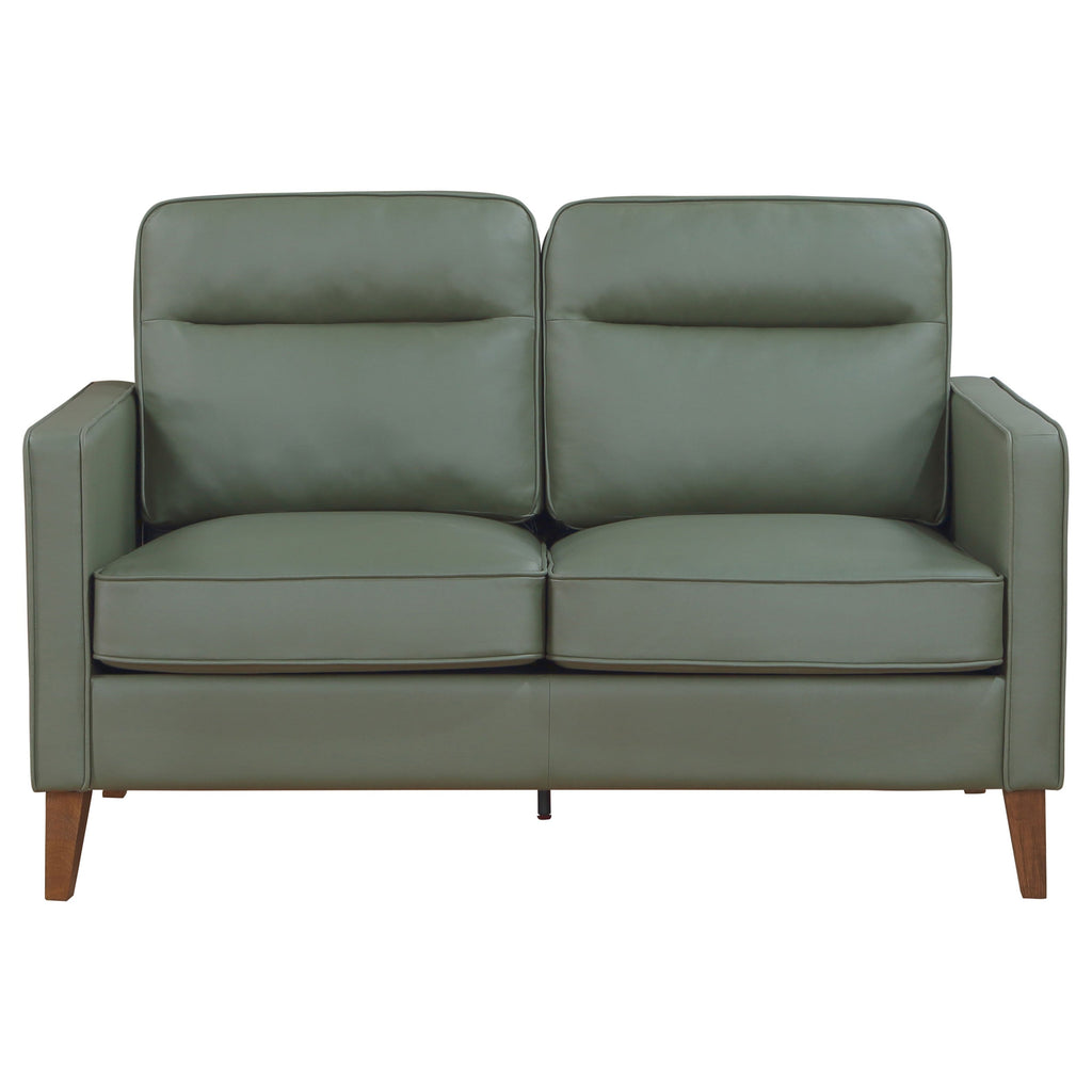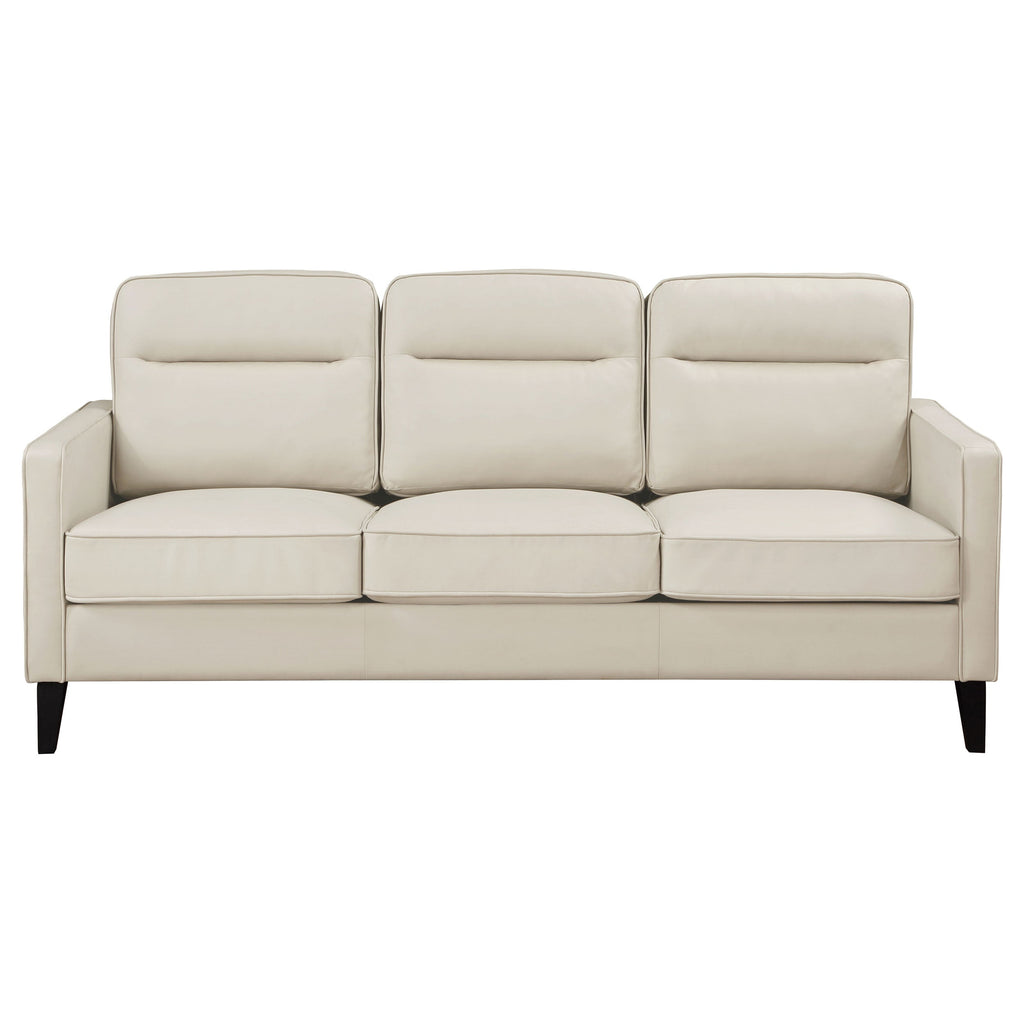 The best of casual modern design motifs add a tasteful look to updated living rooms and dens with a two-piece sofa set created for impact. The sofa and loveseat set adopts a clean style approach to contemporary spaces, combining cozy padding with a structured silhouette. Plywood framing is sturdy and secure, covered with foam padding, and upholstered with easy-care leatherette fabric. Removeable back cushions with subtle horizontal tufting join reversible seat cushions, all nestled in slender frames with narrow track arms. Choose this two-piece sofa set for a timeless look that’s easy to complement with accessories and accent decor.