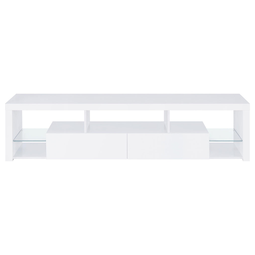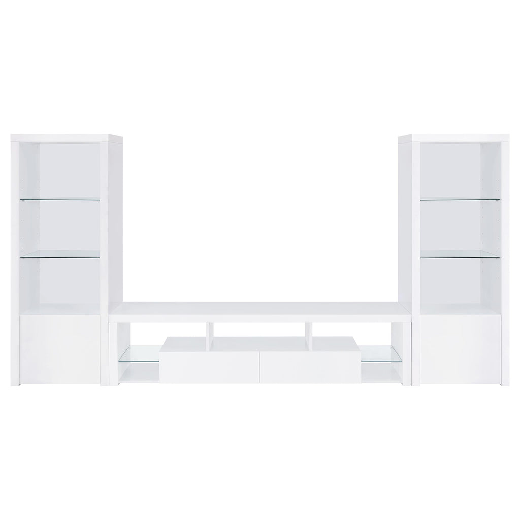 Elevate your entertainment arena with our sleek, modern TV stand. Drenched in a pristine glossy white-on-white finish, it radiates sophistication, accentuated by clear glass details. Its soft-close drawers ensure smooth operation, while glass shelves present a chic display option. Generous storage compartments cater to all your media needs. To enhance the ensemble, the set comes with matching media towers, amplifying storage capacity and offering a unified, stylish appearance. This combo not only meets functional demands but also serves as a captivating focal point in any contemporary space.
