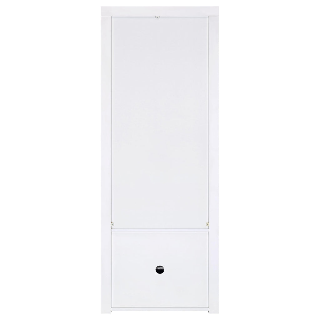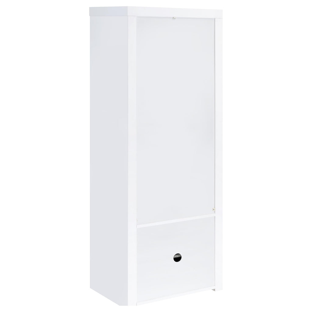 Extend a media console or add easy display space in a den or bedroom with this contemporary tower. Designed to accompany the matching media console, the tower adds a lower cabinet with shelving inside, and a pair of glass display shelves. It’s the perfect solution when both hidden and accessible storage are desired. A crisp white finish adds to the modern look and complements virtually any space. Melamine paper surfaces are designed for durability, perfect for everything from games and media to charming decor.