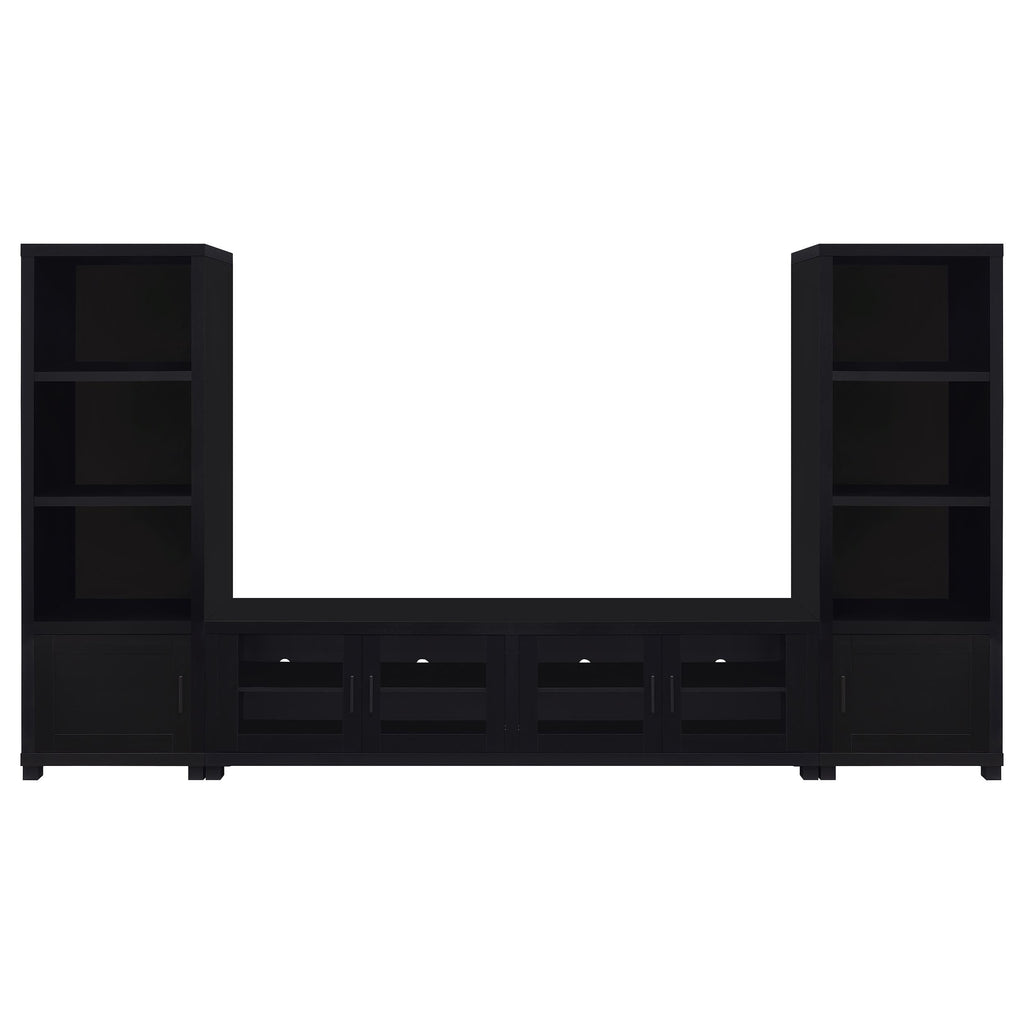Transform your living room into the ultimate entertainment hub with this sophisticated three-piece entertainment center. Anchored by a commanding 79-inch TV stand, this set is designed to accommodate up to an 85-inch television, bringing a cinematic experience right into your home. The TV stand features four doors that open to adjustable shelves, perfect for organizing your media devices, gaming consoles, and more. Flanking the TV stand, two sleek media towers offer additional storage and display options, with open shelving for your favorite books and decor, and a concealed cabinet for hidden storage. Finished in a striking black hue, this entertainment center blends modern elegance with functional design, creating a seamless and stylish focal point in your living space.