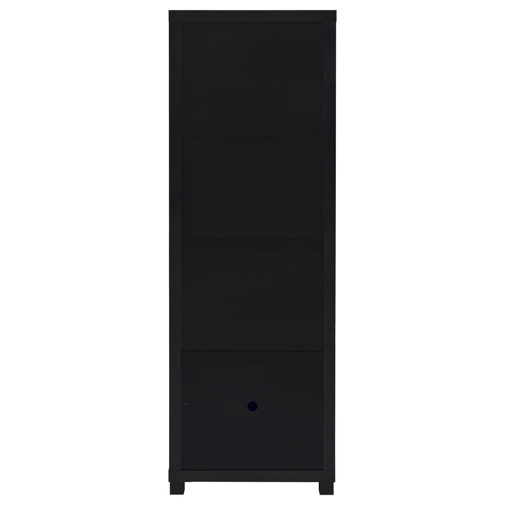Media towers feature three open shelves and a single-door cabinet for versatile storage