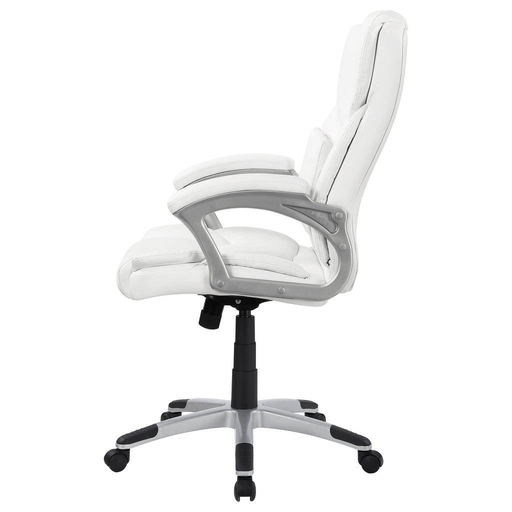 Try something different in an office space. At home or work, this office chair makes sitting a comfy experience and mobility a breeze. Fresh, bright white leatherette upholstery wakes up an office. Generously padded sections ensure excellent bodily support. Armrests and adjustable height settings make it easy to find the perfect working position.