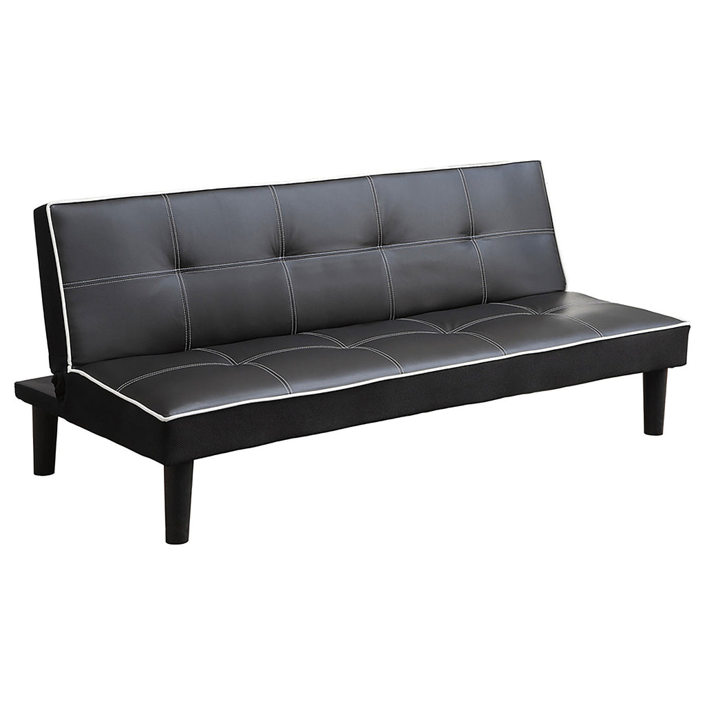Add sleek and versatile structure to any living room with this black sofa bed. Featuring a modern silhouette, the cushions rest on top of a durable kiln dried hardwood frame. The dark leatherette upholstery is given contrast with a lightly hued piping and square-shaped tufting. Designed for comfort, this sofa bed is complete with sinuous spring decking and high-density foam. This sophisticated piece is also available in grey with black piping and brown with tan piping.