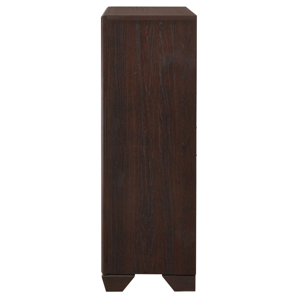 With crisp, clean lines and a simple design, this chest exudes simple elegance. Black, recessed grooves create a cool contrast to its dark cocoa finish. Its legs are crafted with a tapered design, providing sturdy support. A simple, square silhouette lends a touch of transitional appeal to match with a variety of decor styles. Exclusive to Coaster, this chest offers style, versatility, and exceptional value.