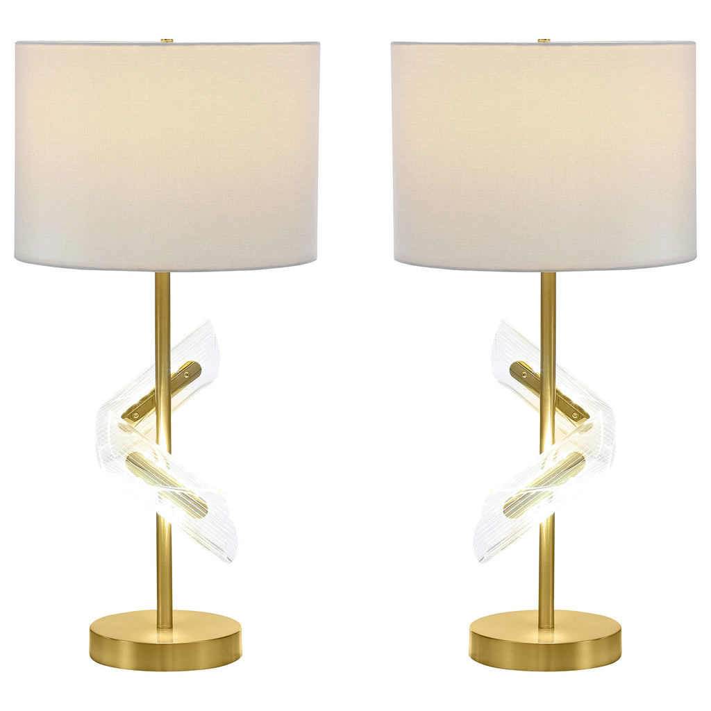 Designed to dazzle, this pair of gold table lamps features a clean drum shade paired with sculptural acrylic accents that wrap around the slender frame. A brilliant LED light glows from within the swirling acrylic, bringing dimension and ambient lighting to the base. The matte gold finish and fabric shade offer modern elegance, making these lamps ideal for nightstands, console tables, or desks in any contemporary setting.
