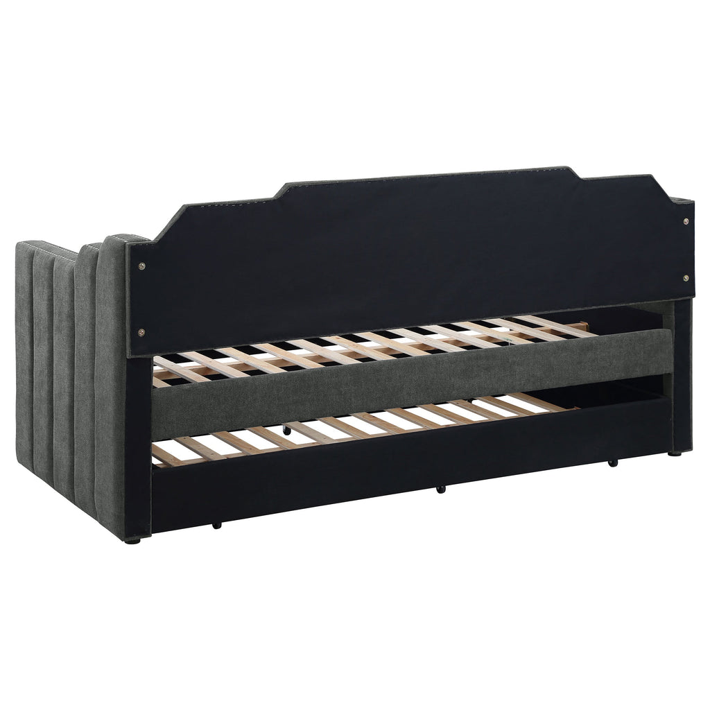 Welcome guests to stay for the night with this contemporary twin daybed and trundle set. Wrapped entirely in a charcoal gray velvet fabric with an Art Deco-inspired channel tufted design and stepped edges, this twin daybed is as stylish as it is comfortable. Slim, straight armrests outlined in a polished chrome nailhead trim define this daybed silhouette while a discreet smooth panel disguises the hidden trundle beneath. Elegant with a modern flair, this twin daybed and trundle is the perfect addition to compact multipurpose spaces like a home office guestroom. And with its gray velvet fabric, this daybed complements your already existing color palette too.