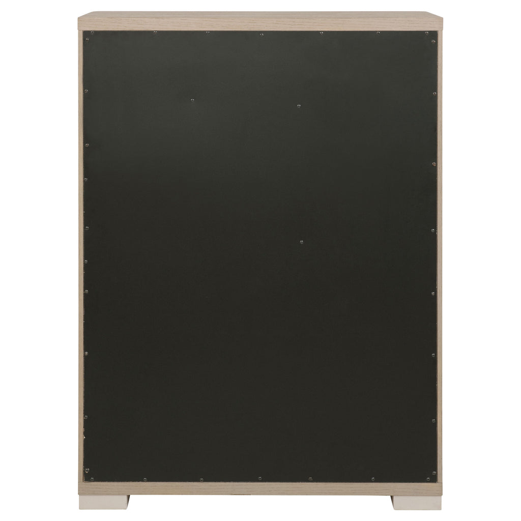 Five-drawer chest with a light elm finish for a contemporary, stylish look