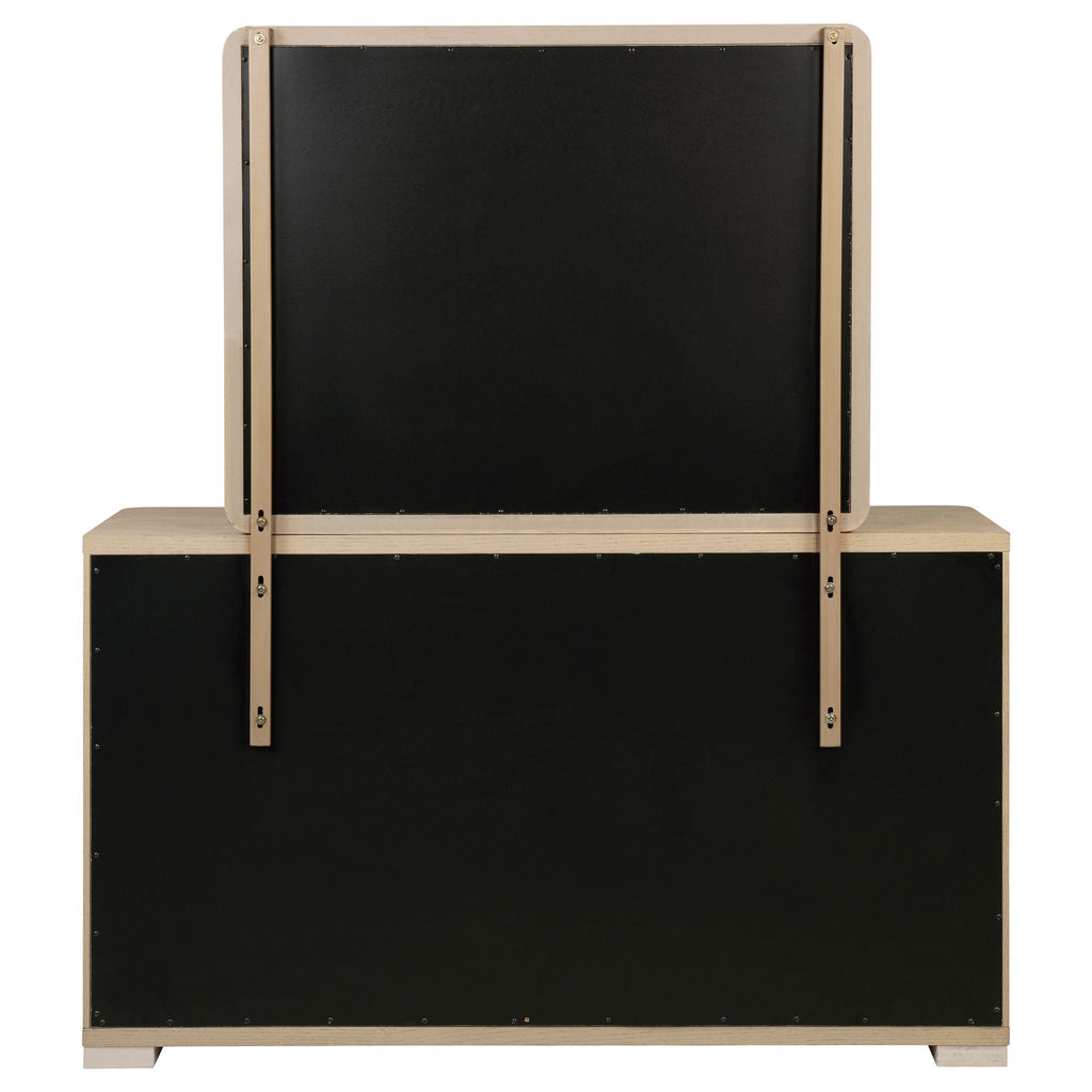 The dresser and mirror set combines function and elegance with its light elm finish and sleek contemporary design. The dresser features six extra-large tinted drawers, each crafted with French and English dovetail construction for durability. Brushed nickel fingertip pulls and rounded corners add refinement, while the matching rectangular mirror completes the look with its clean lines and softly rounded edges, creating a cohesive, modern bedroom ensemble.