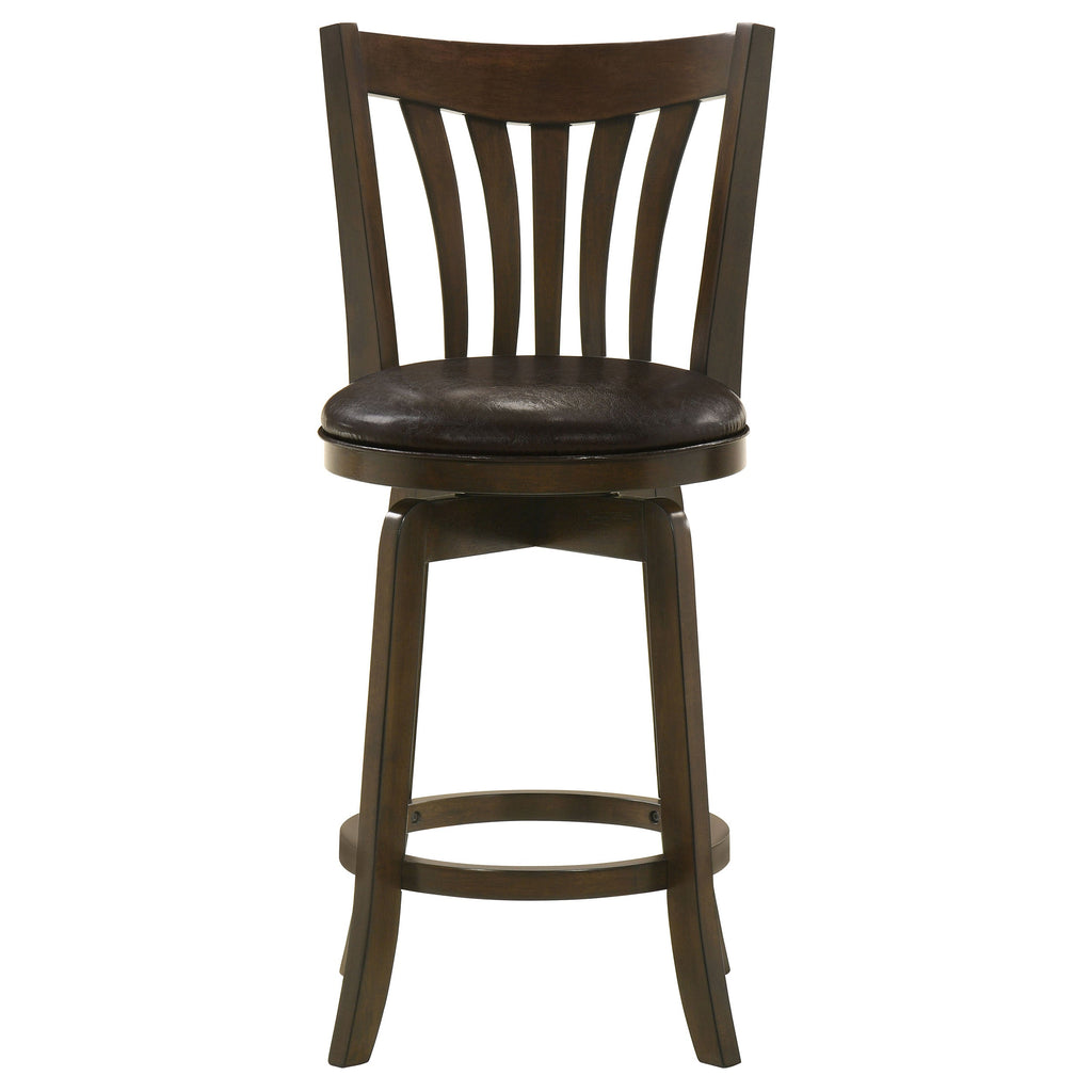 Classic style infuses a traditional swivel counter stool. Perfect for coffee, a nightcap and everything in between, the stool boasts a 360-degree swivel seat with plush foam padding. Its dark brown faux leather upholstery is smooth and inviting, perfectly complementing a dark cherry wood finish. The chair features a slatted back that brings a lightened look and feel, perfect for your kitchen or dining room. The base features gently flared legs and a built-in ring footrest, perfect for lounging with a drink and catching up with friends or family.